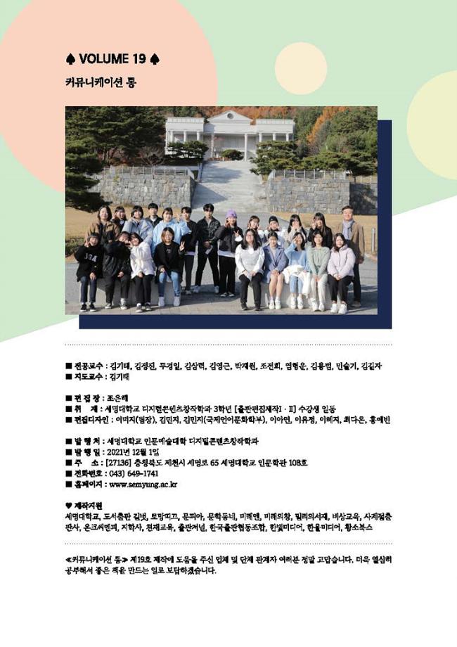 올해 발행된 [커뮤니케이션 통] 제19호는 전체 칼라 인쇄의 5*7배판(A4) 크기에 본문 128쪽 분량이며, 교내외에 널리 배포될 예정이다.