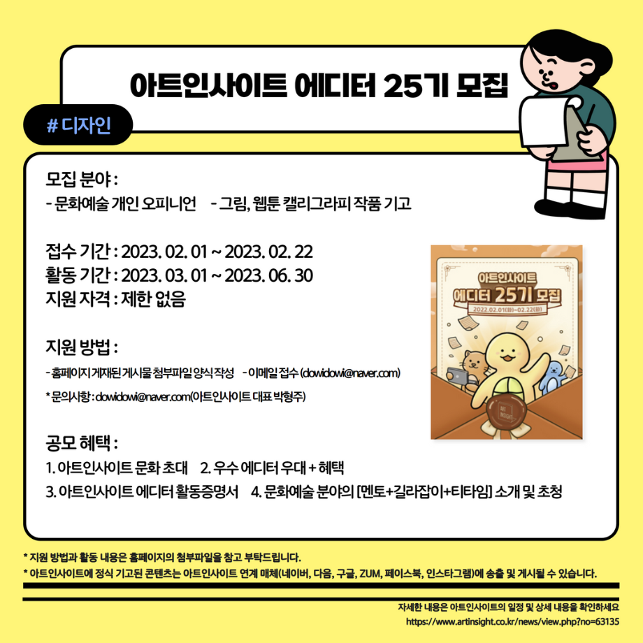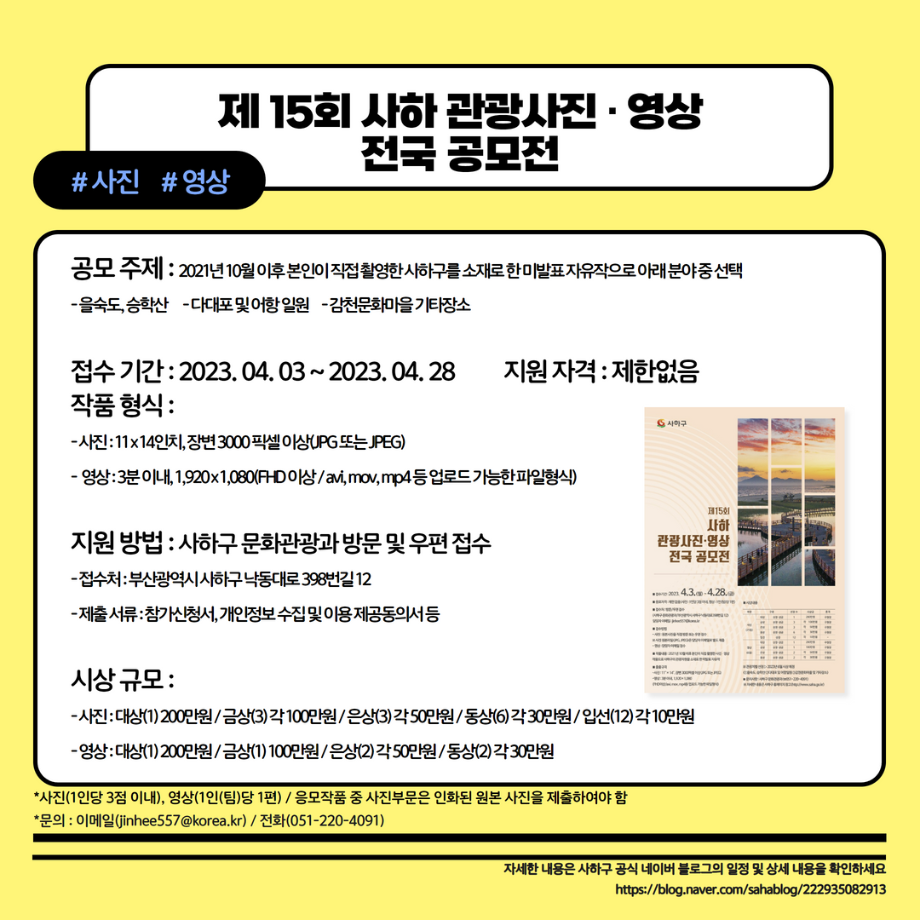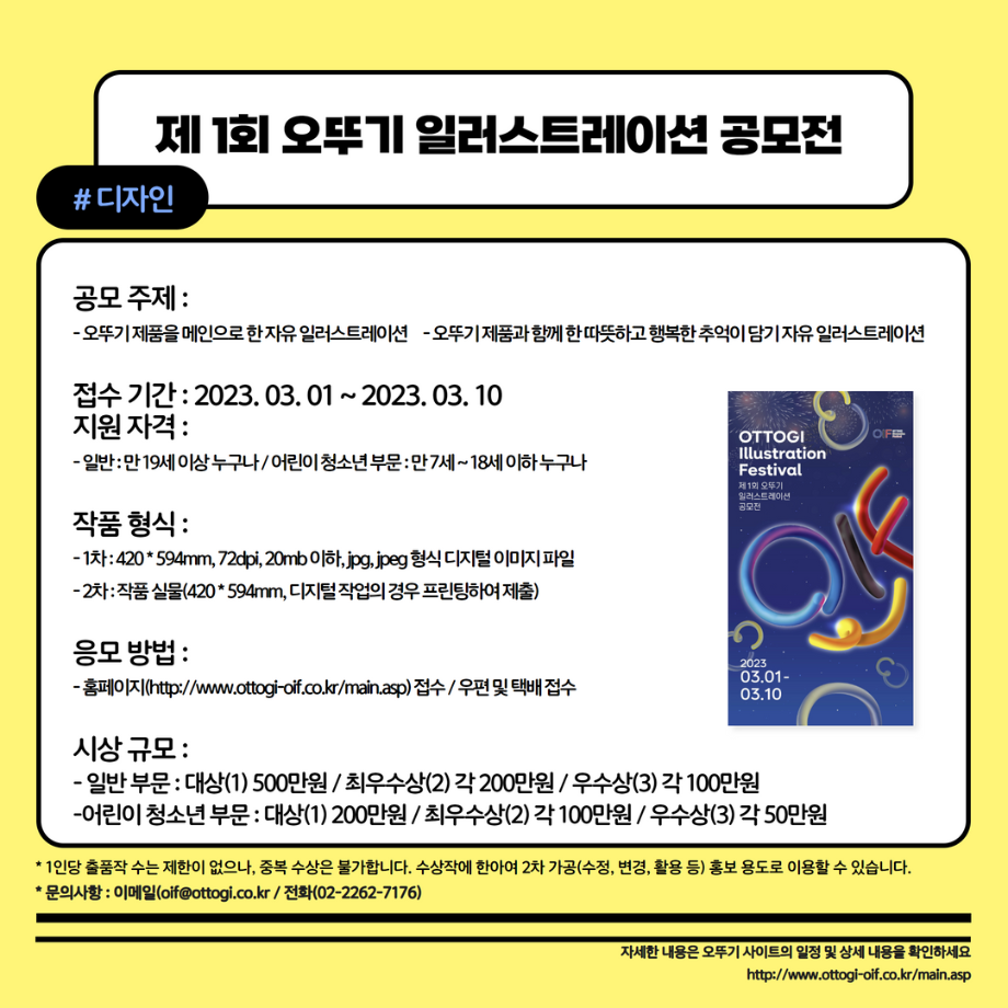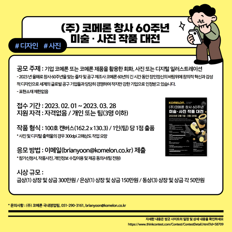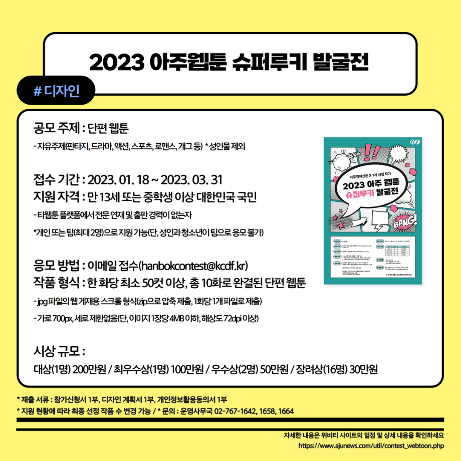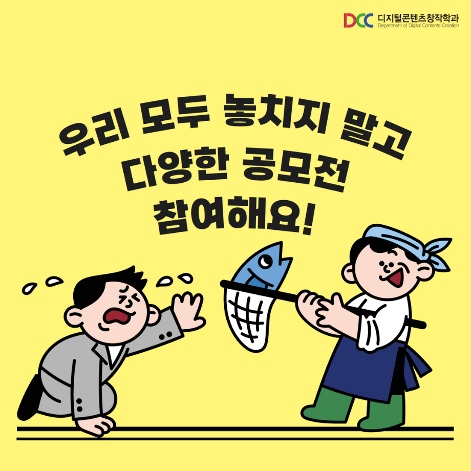 본문 시작 홈으로 MCC News 학과소개 교수소개 학과과정 MCC News MCC SNS 홈페이지가이드 학과 및 재학생 학과 및 재학생 교수 및 졸업생 미디어 정보통 학과 및 재학생 페이스북 트위터 프린트 2023학년도 교외 공모전 알려드려요! 2탄 디지털콘텐츠창작학과 3819 2023-02-14 !2023학년도 영상, 디자인, 사진 분야의 공모전을 알려드립니다! 얼마 남지 않은 겨울방학 공모전에 참여하면서 경험과 실력을 쌓을 수 있는 기회를 놓치지 마세요! 목록 이전23학번 신입생들을 위한 디콘창 Q&A❓ 다음 🍭 오늘의 디콘 12탄 🍭 담당부서 : 미디어콘텐츠창작학과 담당자 : - 연락처 : 043-649-1741 최종수정일 : 2024-10-26 만족도조사 만족도 조사 이 페이지에서 제공하는 정보에 대하여 만족하시나요? 매우만족 만족 보통 불만족 매우불만족