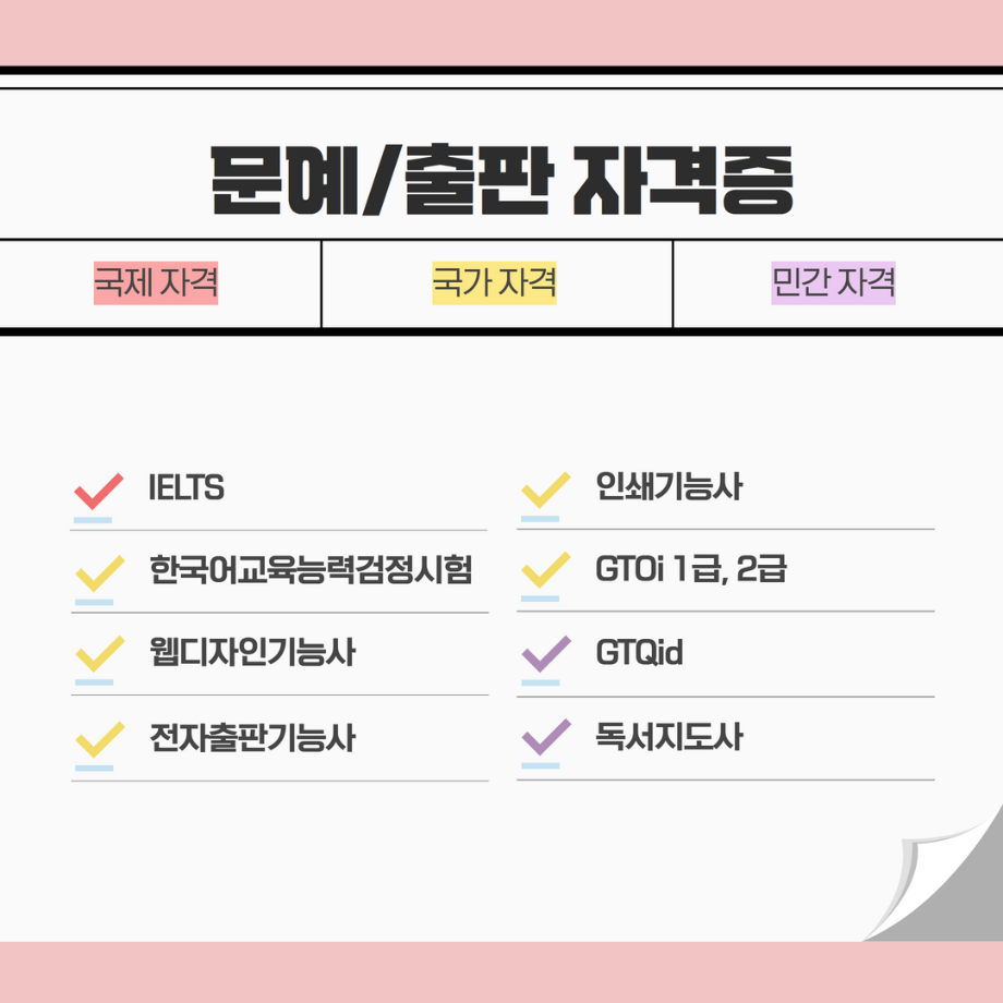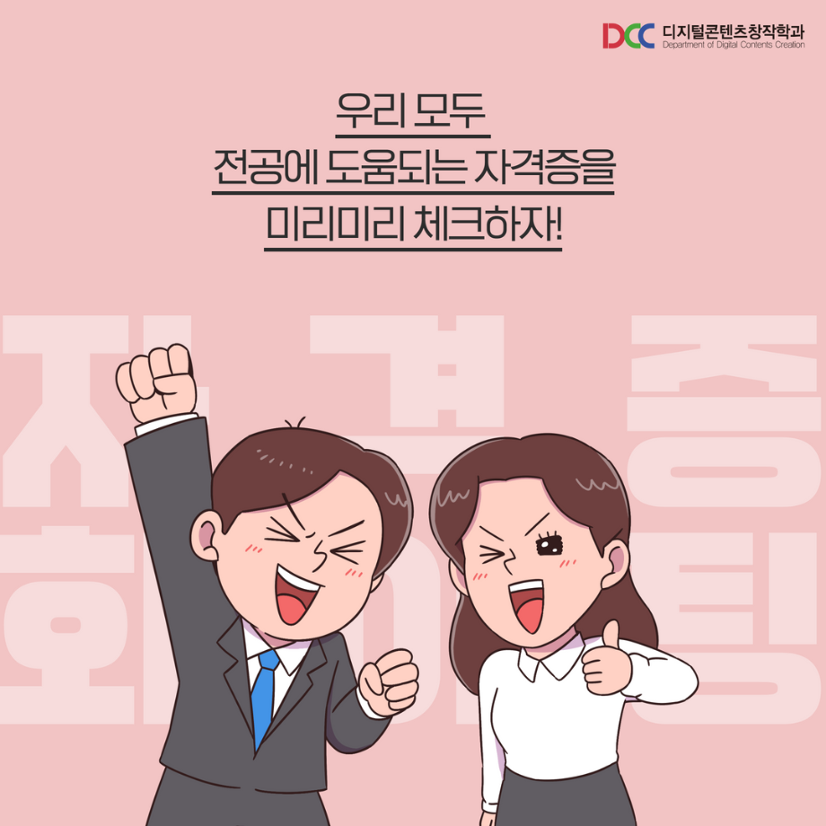 본문 시작 홈으로 MCC News 학과소개 교수소개 학과과정 MCC News MCC SNS 홈페이지가이드 학과 및 재학생 학과 및 재학생 교수 및 졸업생 미디어 정보통 학과 및 재학생 페이스북 트위터 프린트 미리 취득하면 도움 되는 자격증📝 디지털콘텐츠창작학과 5876 2023-04-07 문예,출판 관련 자격증을 알려드립니다! 자격증은 국제/국가/민간으로 나뉘며 총 6개의 자격증이 있습니다! 각 전공에 도움 되는 자격증을 미리 확인하여 취득할 수 있는 기회를 놓치지 마세요! 목록 이전🍭 오늘의 디콘 13탄 🍭 다음 🍭 오늘의 디콘 14탄 🍭 담당부서 : 미디어콘텐츠창작학과 담당자 : - 연락처 : 043-649-1741 최종수정일 : 2024-10-26 만족도조사 만족도 조사 이 페이지에서 제공하는 정보에 대하여 만족하시나요? 매우만족 만족 보통 불만족 매우불만족