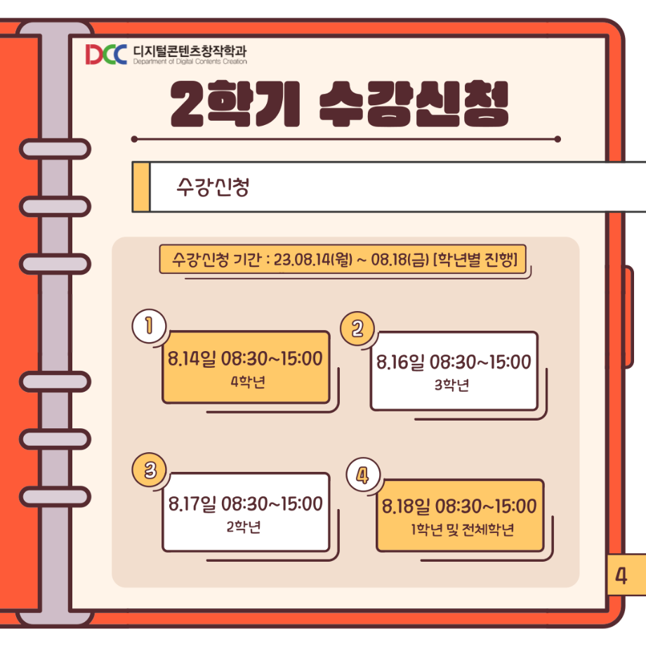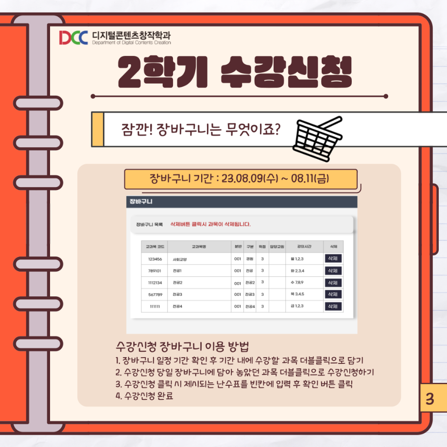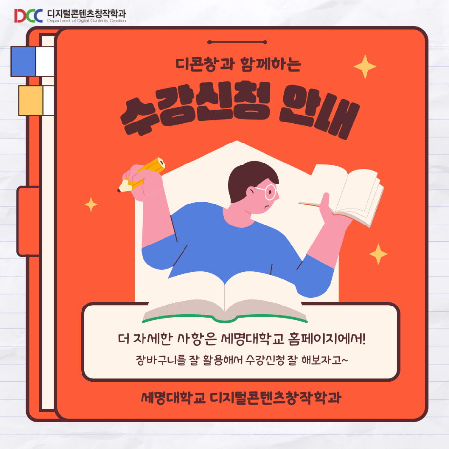 본문 시작 홈으로 MCC News 학과소개 교수소개 학과과정 MCC News MCC SNS 홈페이지가이드 학과 및 재학생 학과 및 재학생 교수 및 졸업생 미디어 정보통 학과 및 재학생 페이스북 트위터 프린트 📚디콘창이 알려주는 수강신청 안내📚 디지털콘텐츠창작학과 3579 2023-08-10 디콘창이 알려주는 수강신청 방법을 통해 모두 올클! 성공하시길 바라요! 자세한 사항은 세명대학교 홈페이지를 통해 확인할 수 있습니다! 모두들 수강신청 화이팅하시길 바라요!! 목록 이전🍭 오늘의 디콘 19탄 🍭 다음 23년도 교외 공모전 알려드려요‼ 3탄 담당부서 : 미디어콘텐츠창작학과 담당자 : - 연락처 : 043-649-1741 최종수정일 : 2024-10-26 만족도조사 만족도 조사 이 페이지에서 제공하는 정보에 대하여 만족하시나요? 매우만족 만족 보통 불만족 매우불만족
