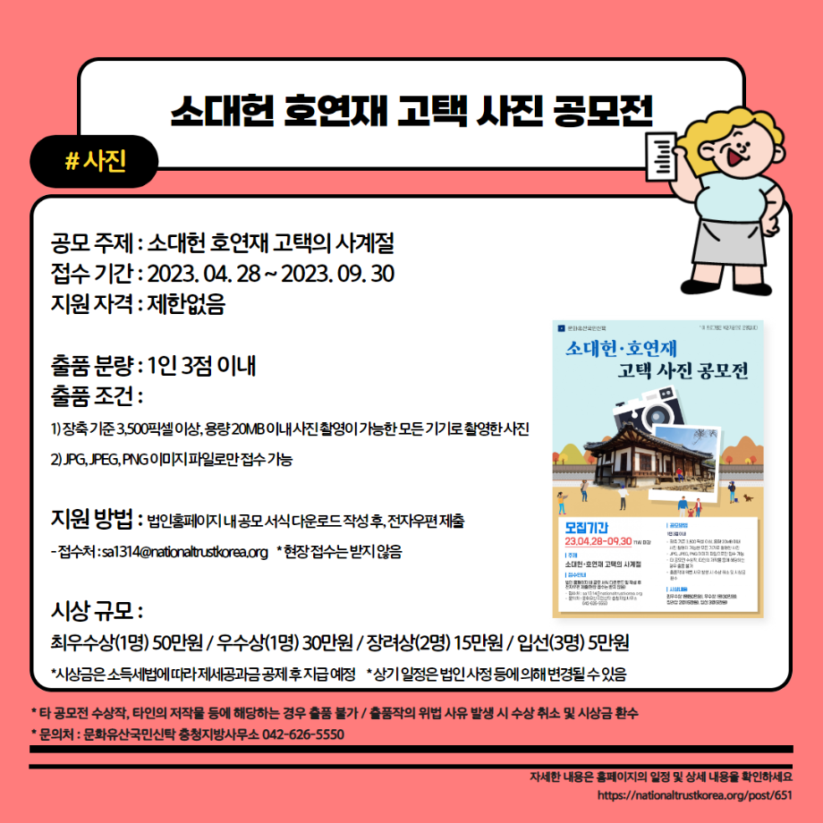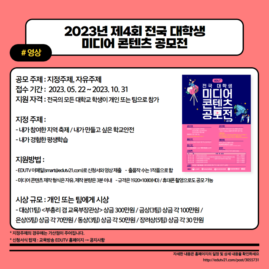 본문 시작 홈으로 MCC News 학과소개 교수소개 학과과정 MCC News MCC SNS 홈페이지가이드 학과 및 재학생 학과 및 재학생 교수 및 졸업생 미디어 정보통 학과 및 재학생 페이스북 트위터 프린트 23년도 교외 공모전 알려드려요‼ 3탄 디지털콘텐츠창작학과 3698 2023-08-14 23년도 영상, 디자인, 사진 분야의 공모전을 알려드립니다! 얼마 남지 않은 여름방학동안 공모전에 참여하면서 경험과 실력을 쌓을 수 있는 기회를 놓치지 마세요! 목록 이전📚디콘창이 알려주는 수강신청 안내📚 다음 이런 졸업작품도 있다고? "커뮤니케이션 통" 담당부서 : 미디어콘텐츠창작학과 담당자 : - 연락처 : 043-649-1741 최종수정일 : 2024-10-26 만족도조사 만족도 조사 이 페이지에서 제공하는 정보에 대하여 만족하시나요? 매우만족 만족 보통 불만족 매우불만족