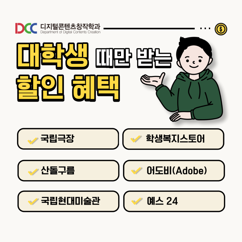 본문 시작 홈으로 MCC News 학과소개 교수소개 학과과정 MCC News MCC SNS 홈페이지가이드 학과 및 재학생 학과 및 재학생 교수 및 졸업생 미디어 정보통 학과 및 재학생 페이스북 트위터 프린트 학생회가 알려주는 재학생 할인 혜택 디지털콘텐츠창작학과 8316 2023-10-16 대학생 때만 받을 수 있는 할인 혜택이 있다고?! 학생회가 정리해서 알려드려요!! 목록 이전🍭 오늘의 디콘 21탄 🍭 다음 장학금 받는 꿀팁🎓 담당부서 : 미디어콘텐츠창작학과 담당자 : - 연락처 : 043-649-1741 최종수정일 : 2024-10-26 만족도조사 만족도 조사 이 페이지에서 제공하는 정보에 대하여 만족하시나요? 매우만족 만족 보통 불만족 매우불만족