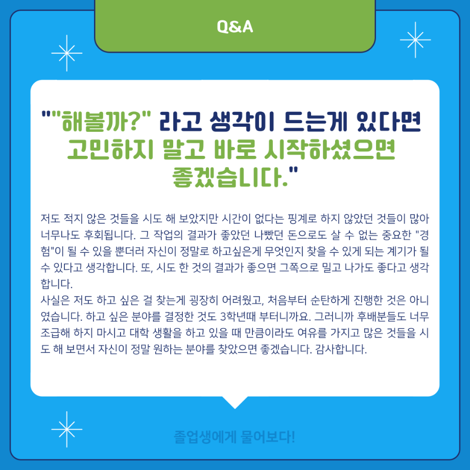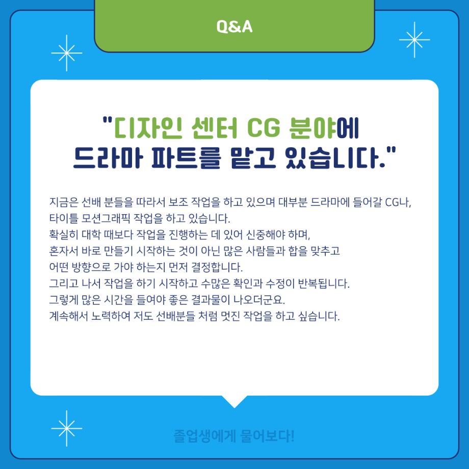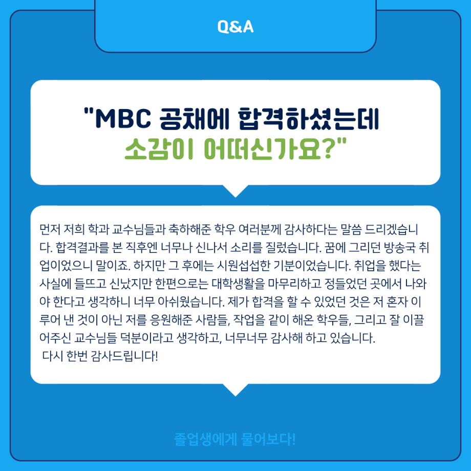 본문 시작 홈으로 MCC News 학과소개 교수소개 학과과정 MCC News MCC SNS 홈페이지가이드 학과 및 재학생 학과 및 재학생 교수 및 졸업생 미디어 정보통 학과 및 재학생 페이스북 트위터 프린트 ‼재학생이 묻고 졸업생이 답하다‼ 디지털콘텐츠창작학과 2882 2024-02-01 MBC 본사 영상미술국 공채시험 합격을 하신 김민재 선배님의 인터뷰 내용을 담았습니다! 재학생분들의 도움이 되길 바라며 많은 관심 부탁드립니다! 목록 이전배고픈 대학생을 통해 알아본 먹거리&맛집&맛팁 소개(2) 다음 👨🎓👩🎓 디지털콘텐츠창작학과 학위수여식 담당부서 : 미디어콘텐츠창작학과 담당자 : - 연락처 : 043-649-1741 최종수정일 : 2024-10-26 만족도조사 만족도 조사 이 페이지에서 제공하는 정보에 대하여 만족하시나요? 매우만족 만족 보통 불만족 매우불만족