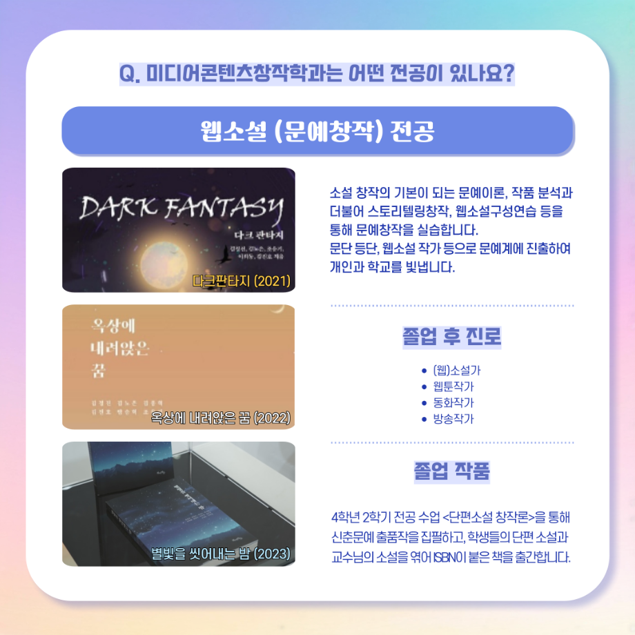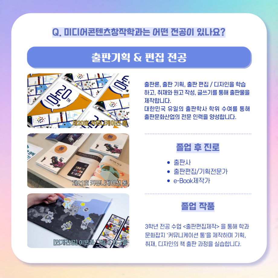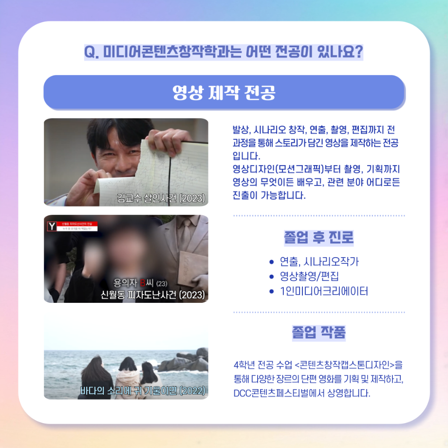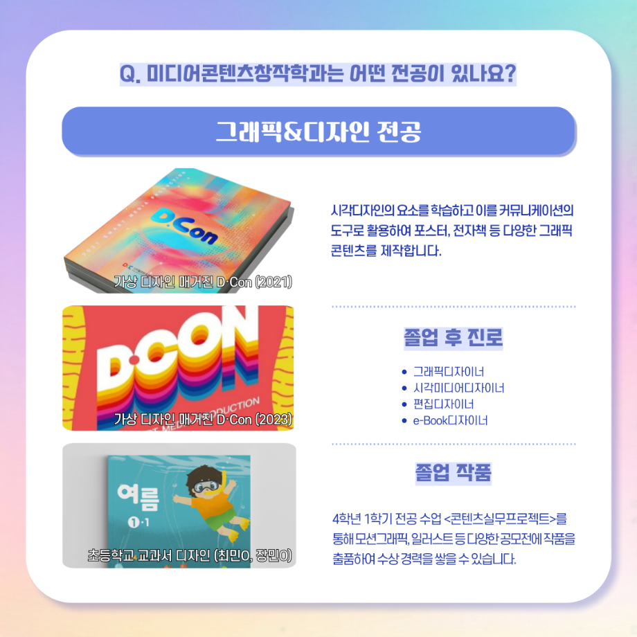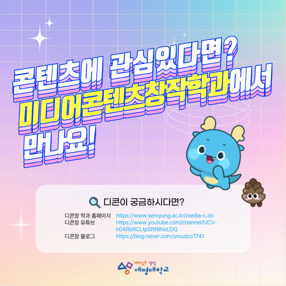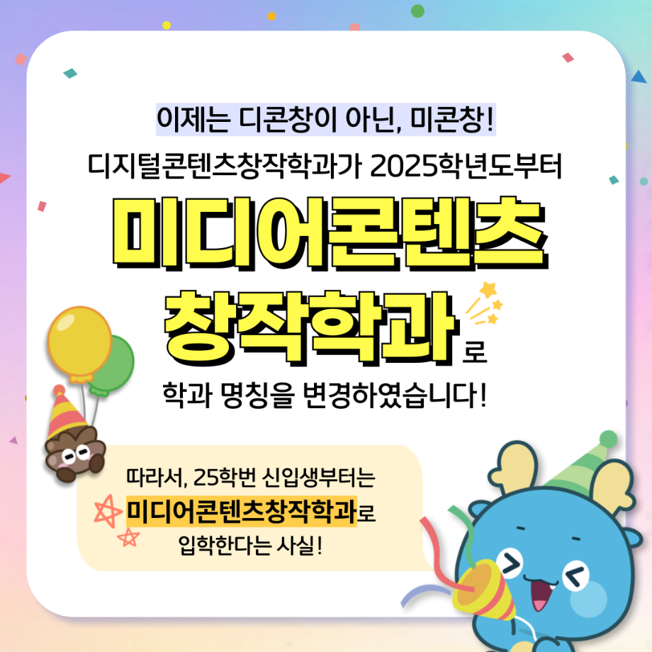 본문 시작 홈으로 MCC News 학과소개 교수소개 학과과정 MCC News MCC SNS 홈페이지가이드 학과 및 재학생 학과 및 재학생 교수 및 졸업생 미디어 정보통 학과 및 재학생 페이스북 트위터 프린트 디콘창, 미디어콘텐츠창작학과로 이름을 변경하다?! 미디어콘텐츠창작학과 2047 2024-09-12 디지털콘텐츠창작학과가 2025년도부터 학과명을 미디어콘텐츠창작학과로 변경하게 되었습니다! 기존 학과명보다 더욱 명확하게 방향성과 특성을 나타내게 되어 정말로 기쁩니다 목록 이전세명대학교에서 알려주는 입시 소식! 다음 2024년 추석맞이 특별 이벤트 담당부서 : 미디어콘텐츠창작학과 담당자 : - 연락처 : 043-649-1741 최종수정일 : 2024-10-26 만족도조사 만족도 조사 이 페이지에서 제공하는 정보에 대하여 만족하시나요? 매우만족 만족 보통 불만족 매우불만족