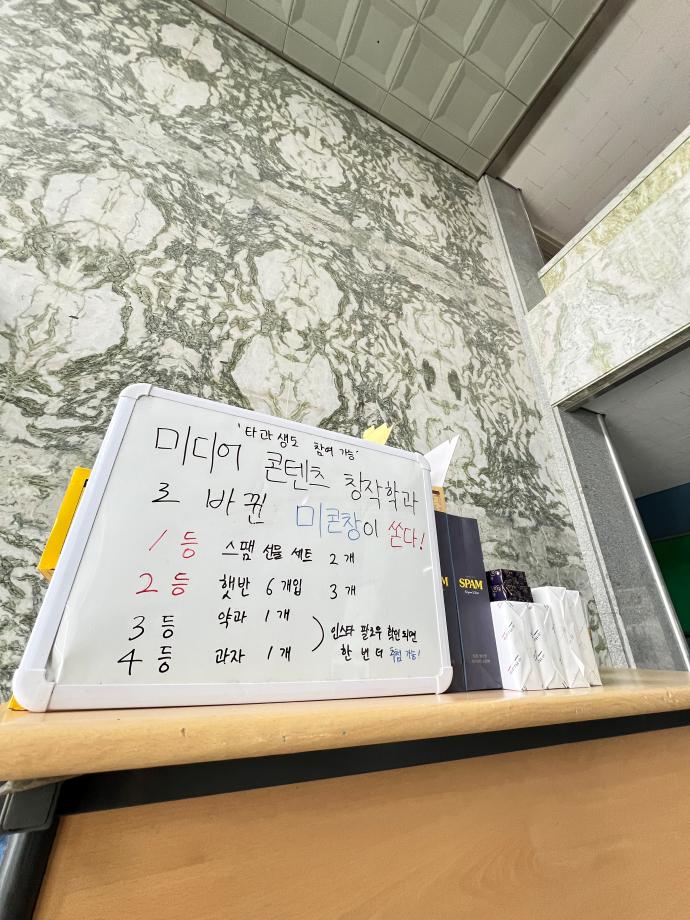 본문 시작 홈으로 MCC News 학과소개 교수소개 학과과정 MCC News MCC SNS 홈페이지가이드 학과 및 재학생 학과 및 재학생 교수 및 졸업생 미디어 정보통 학과 및 재학생 페이스북 트위터 프린트 2024년 추석맞이 특별 이벤트 미디어콘텐츠창작학과 1999 2024-09-13 지난 11일 미디어콘텐츠창작학과 학생회에서 추석맞이 특별 이벤트를 진행했습니다! 추석을 맞이해 학우 여러분들이 뽑기를 통해 다양한 상품을 받아 가셨는데요! 여러분들의 성원에 힘 입어 이벤트 시작 3시간 만에 상품 소진으로 인해 종료하였습니다. 미콘창 학생 뿐만이 아닌 타과 학생 분들도 뽑기에 참여하여 함께 하는 미콘창의 모습을 보여줄 수 있었습니다! 목록 이전디콘창, 미디어콘텐츠창작학과로 이름을 변경하다?! 다음 오랜만에 찾아온 미콘먹거리! 담당부서 : 미디어콘텐츠창작학과 담당자 : - 연락처 : 043-649-1741 최종수정일 : 2024-10-26 만족도조사 만족도 조사 이 페이지에서 제공하는 정보에 대하여 만족하시나요? 매우만족 만족 보통 불만족 매우불만족