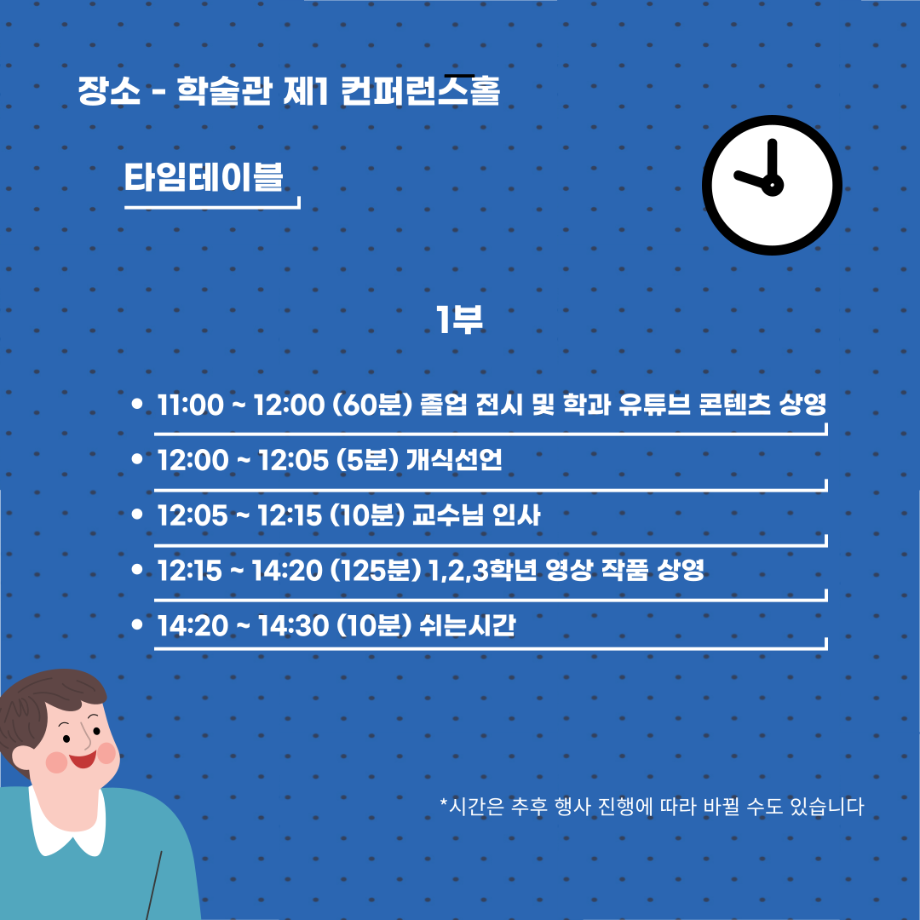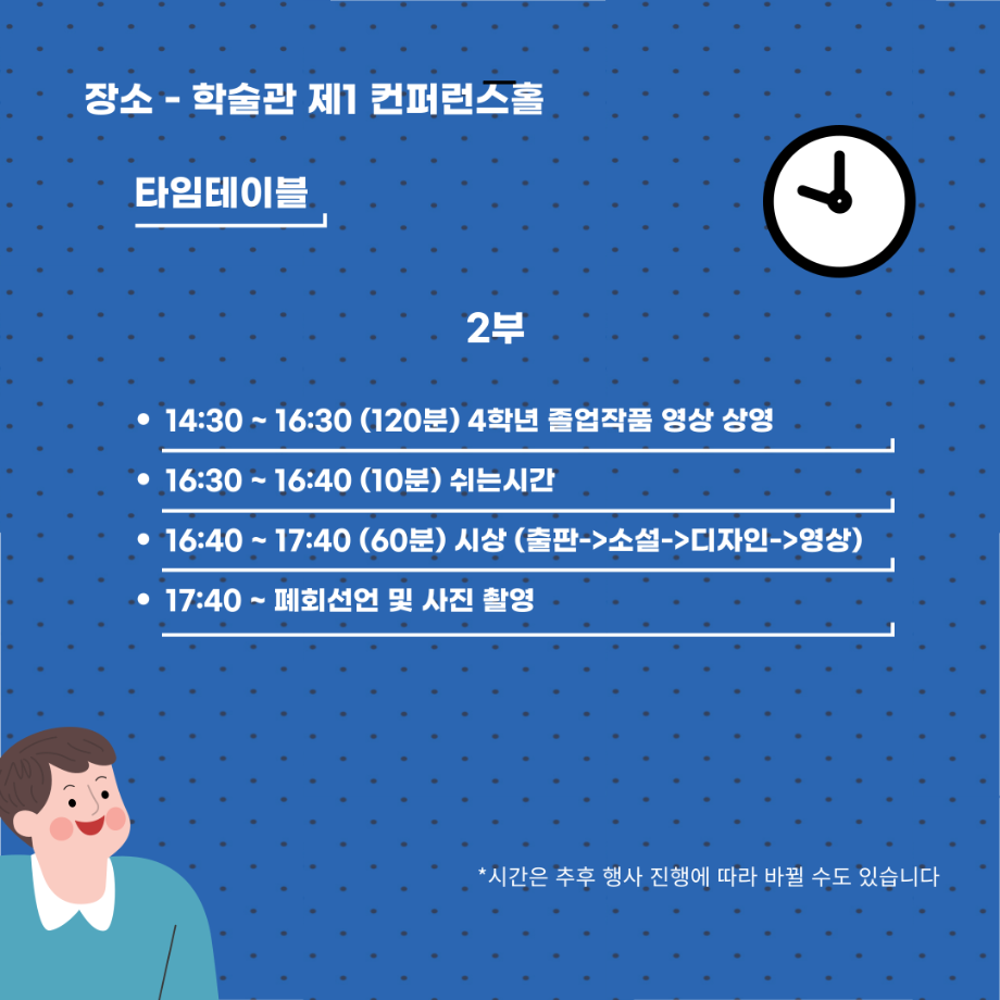 본문 시작 홈으로 MCC News 학과소개 교수소개 학과과정 MCC News MCC SNS 홈페이지가이드 학과 및 재학생 학과 및 재학생 교수 및 졸업생 미디어 정보통 학과 및 재학생 페이스북 트위터 프린트 🎊제22회 DCC 페스티벌🎊 미디어콘텐츠창작학과 2504 2024-11-27 디지털콘텐츠창작학과에서 학기 마지막 행사인 DCC페스티벌을 진행합니다! DCC 페스티벌은 1년동안 학과 학우분들이 제작한 영상, 소설, 디자인, 출판등을 전시 및 상영하는 행사이며 학과의 가장 큰 행사입니다. 일시 - 2024년 12월 3일 화요일 11시 장소 - 학술관 제1컨퍼런스홀 디지털콘텐츠창작학과 이름으로 하는 마지막 행사이자 학우여러분들의 1년동안의 과정, 성과를 볼 수 있는 행사이니 많은 관심과 참여 부탁드립니다! 목록 이전🕵🏻♂미디어콘텐츠창작학과 추리 방탈출🔎 다음 DCC 콘텐츠 페스티벌이 무사히 끝났습니다. 담당부서 : 미디어콘텐츠창작학과 담당자 : - 연락처 : 043-649-1741 최종수정일 : 2024-10-26 만족도조사 만족도 조사 이 페이지에서 제공하는 정보에 대하여 만족하시나요? 매우만족 만족 보통 불만족 매우불만족