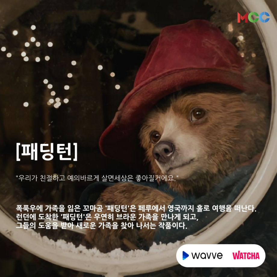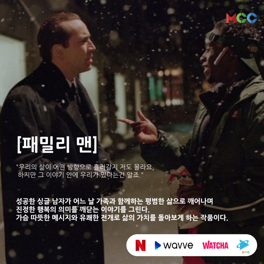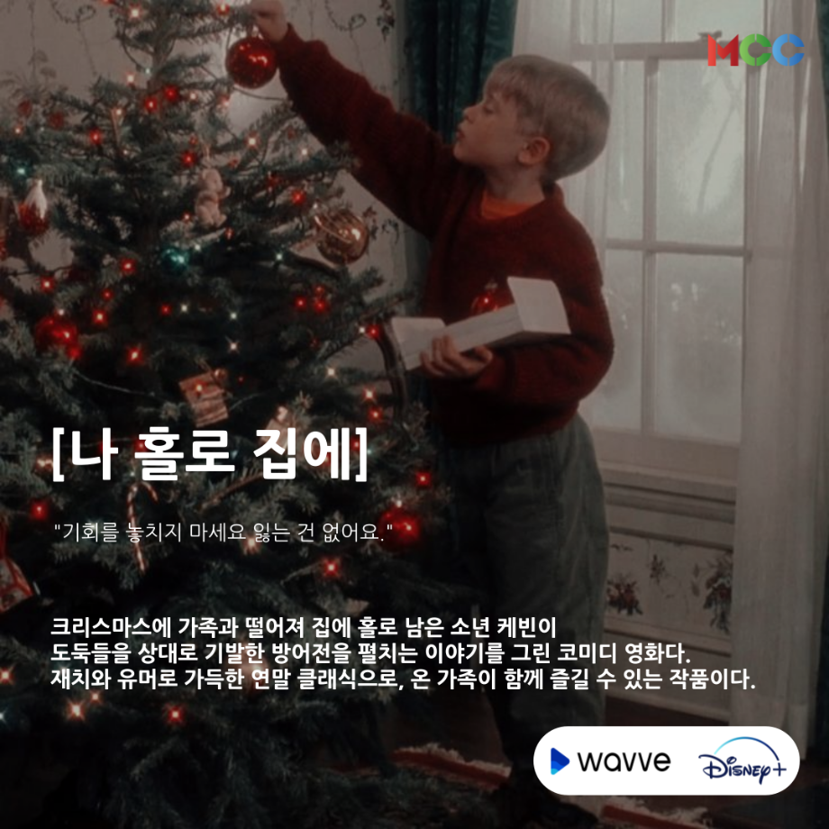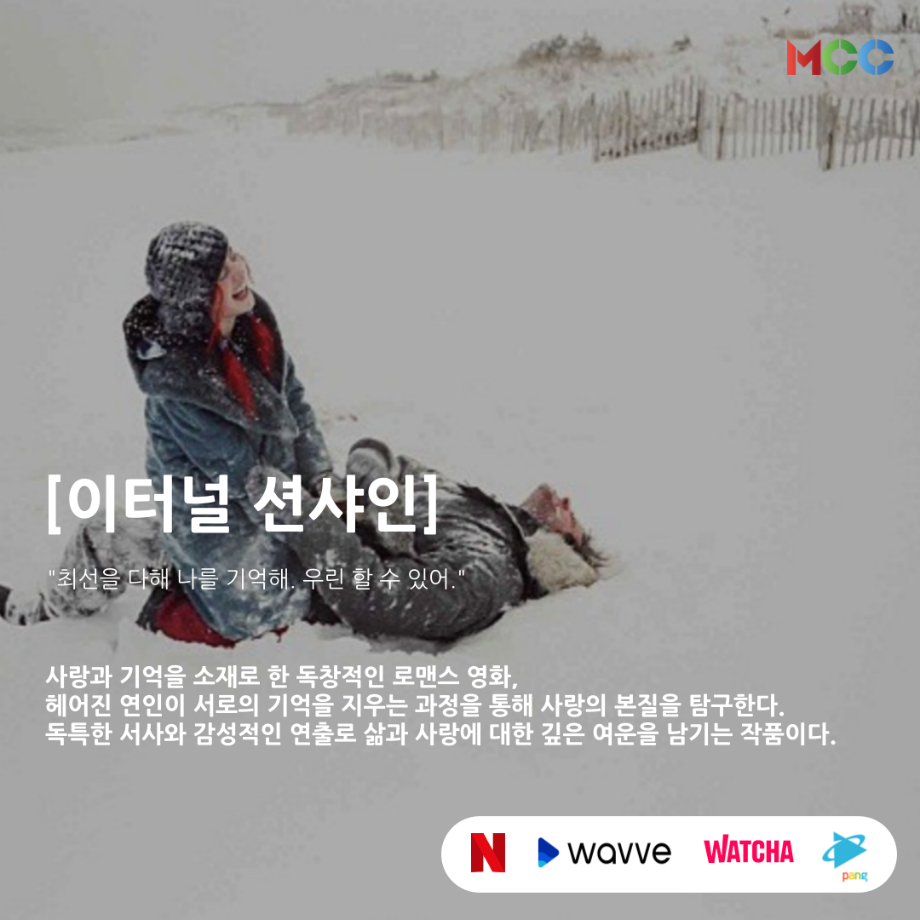 본문 시작 홈으로 MCC News 학과소개 교수소개 학과과정 MCC News MCC SNS 홈페이지가이드 학과 및 재학생 학과 및 재학생 교수 및 졸업생 미디어 정보통 학과 및 재학생 페이스북 트위터 프린트 "겨울 감성 가득! ❄ 추천 영화 6편" 미디어콘텐츠창작학과 2870 2025-01-22 춥고 포근한 계절, 마음까지 따뜻하게 해줄 영화들로 겨울을 더 특별하게 만들어보세요! ☃🎬 📽 1. 이터널 선샤인 📽 2. 패딩턴 📽 3. 패밀리 맨 📽 4. 노팅힐 📽 5. 맨체스터 바이 더 씨 📽 6. 나 홀로 집에 목록 이전학과잡지 <커뮤니케이션 통> 22호 발간! 다음 미콘창이라면 누구나! 필수 자격증 담당부서 : 미디어콘텐츠창작학과 담당자 : - 연락처 : 043-649-1741 최종수정일 : 2024-10-26 만족도조사 만족도 조사 이 페이지에서 제공하는 정보에 대하여 만족하시나요? 매우만족 만족 보통 불만족 매우불만족