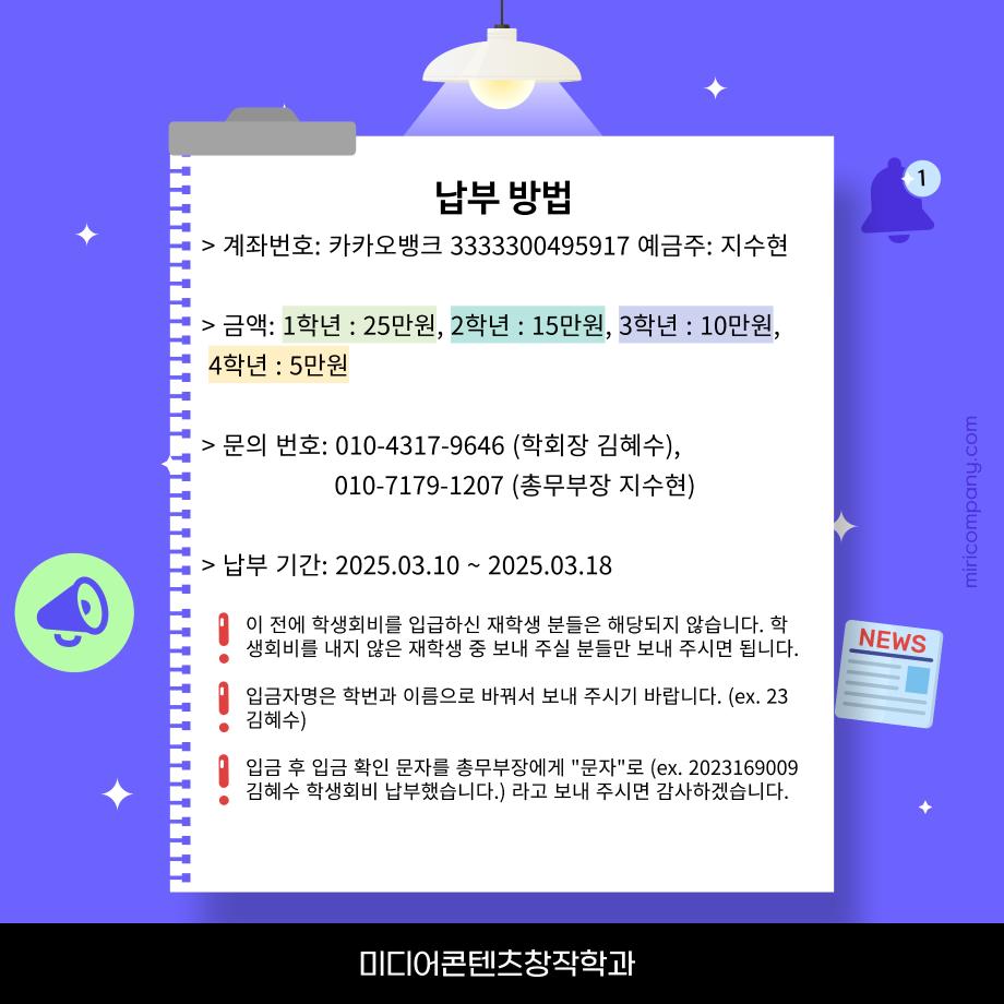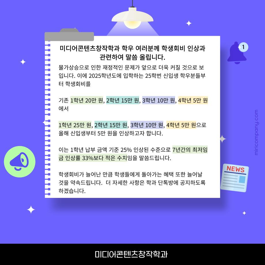 본문 시작 홈으로 MCC News 학과소개 교수소개 학과과정 MCC News MCC SNS 홈페이지가이드 학과 및 재학생 학과 및 재학생 교수 및 졸업생 미디어 정보통 학과 및 재학생 페이스북 트위터 프린트 ‼미디어콘텐츠창작학과 학생회비 안내 미디어콘텐츠창작학과 3370 2025-03-10 미디어콘텐텐츠창작학과에서 학생회비 인상과 납부 관련하여 안내드립니다. 더 자세한 사항은 과 단톡방을 통해 안내드리겠습니다. 문의사항이 있다면 카드뉴스에 적혀있는 학회장 또는 총무부장에게 연락바랍니다. 목록 이전‼️학생회 모집 안내 ‼️ 다음 🔥개총&신환회🎊 담당부서 : 미디어콘텐츠창작학과 담당자 : - 연락처 : 043-649-1741 최종수정일 : 2024-10-26 만족도조사 만족도 조사 이 페이지에서 제공하는 정보에 대하여 만족하시나요? 매우만족 만족 보통 불만족 매우불만족