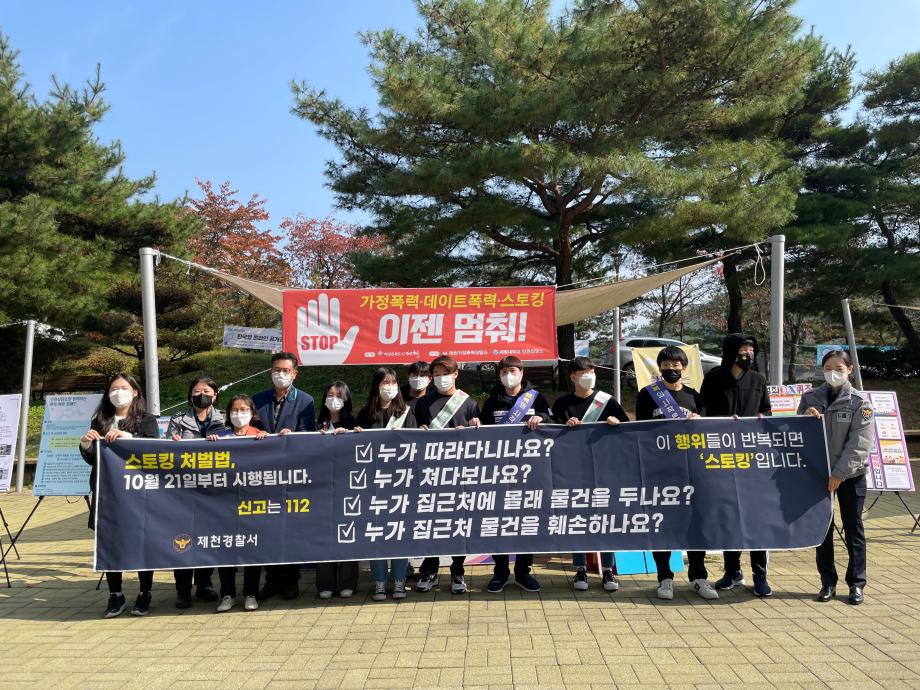 본문 시작 홈으로 커뮤니티 학과안내 교수소개 학과과정 커뮤니티 홈페이지가이드 학과사진첩 공지사항 취업정보 학과사진첩 학과행사 동아리 학생회 교우소식 학과사진첩 페이스북 트위터 프린트 PALETTE 데이트폭력과 스토킹행위 근절을 위한 캠페인 진행 법학과 3779 2021-10-26 세명대학교 법학과(학과장 장성원) 봉사동아리 PALETTE는 2021년 10월 26일(화) 교내 학생회관 앞에서 스토킹처벌법 시행을 맞아 데이트폭력과 스토킹행위 근절을 위한 캠페인을 진행하였다. 이 캠페인에는 세명대학교 인권서포터즈 ‘SMile’과 제천가정폭력상담소, 제천경찰서가 함께 참여하였다. 목록 이전HAN'S 심리상담센터와 상호 교류・협력 협약(MOU) 체결 다음 2021.11.02 경찰 공무원 특강 담당부서 : 법학과 담당자 : - 연락처 : 043-649-1764 최종수정일 : 2024-10-26 만족도조사 만족도 조사 이 페이지에서 제공하는 정보에 대하여 만족하시나요? 매우만족 만족 보통 불만족 매우불만족