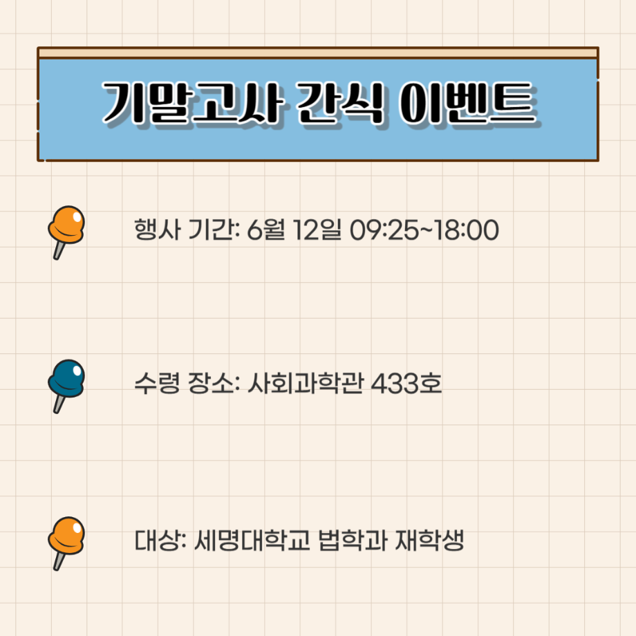 본문 시작 홈으로 커뮤니티 학과안내 교수소개 학과과정 커뮤니티 홈페이지가이드 학과사진첩 공지사항 취업정보 학과사진첩 학과행사 동아리 학생회 교우소식 학과사진첩 페이스북 트위터 프린트 법학과 간식 이벤트🍪 법학과 1574 2025-06-12 법학과 학생회 "다온" 에서 시험으로 지친 학생들을 위해 간식이벤트를 준비했습니다:) 목록 이전2025학년도 법학과 학술캠프 다음 법학과 선배들의 진로 현황 담당부서 : 법학과 담당자 : - 연락처 : 043-649-1764 최종수정일 : 2024-10-26 만족도조사 만족도 조사 이 페이지에서 제공하는 정보에 대하여 만족하시나요? 매우만족 만족 보통 불만족 매우불만족