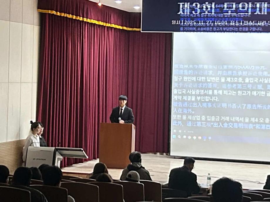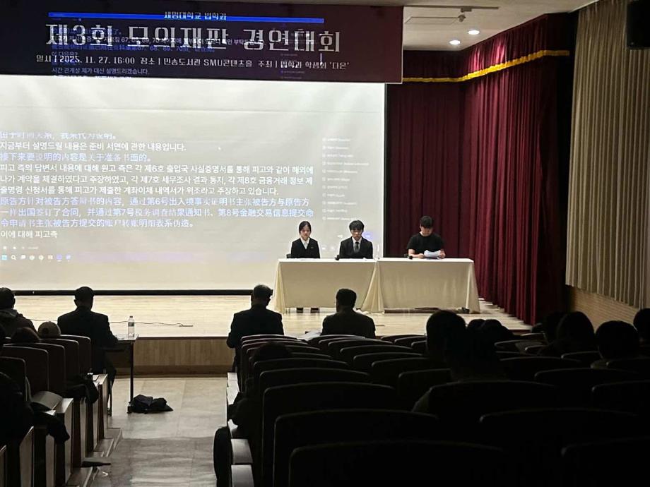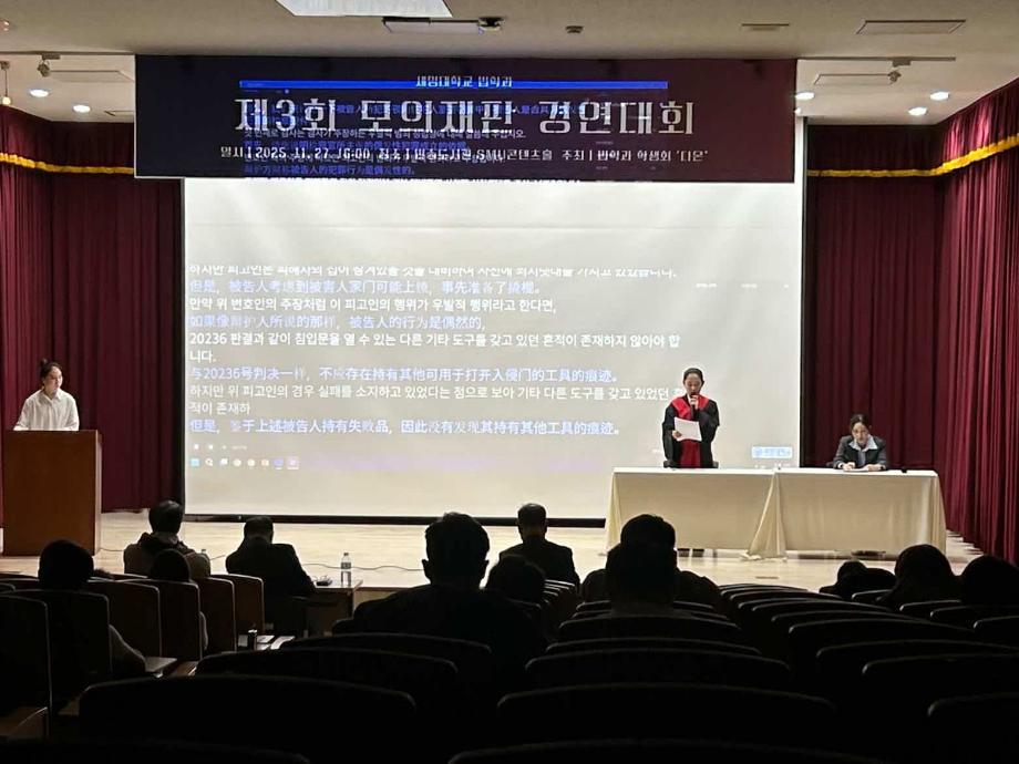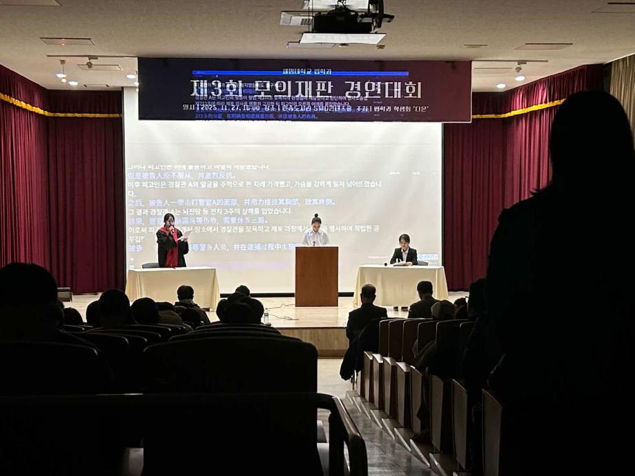 본문 시작 홈으로 커뮤니티 학과안내 교수소개 학과과정 커뮤니티 홈페이지가이드 학과사진첩 공지사항 취업정보 학과사진첩 학과행사 동아리 학생회 교우소식 학과사진첩 페이스북 트위터 프린트 2025학년도 제3회 법학과 모의재판 경연대회 법학과 1458 2025-12-03 2025년 11월 27일 민송도서관 1층 콘텐츠홀에서 법학과 모의재판 경연대회 진행하였습니다. 참여하신 모든 분들 고생 많으셨습니다. 목록 이전2025학년도 법학과 특강 다음 겨울방학 해외 배낭여행-대만 담당부서 : 법학과 담당자 : - 연락처 : 043-649-1764 최종수정일 : 2024-10-26 만족도조사 만족도 조사 이 페이지에서 제공하는 정보에 대하여 만족하시나요? 매우만족 만족 보통 불만족 매우불만족