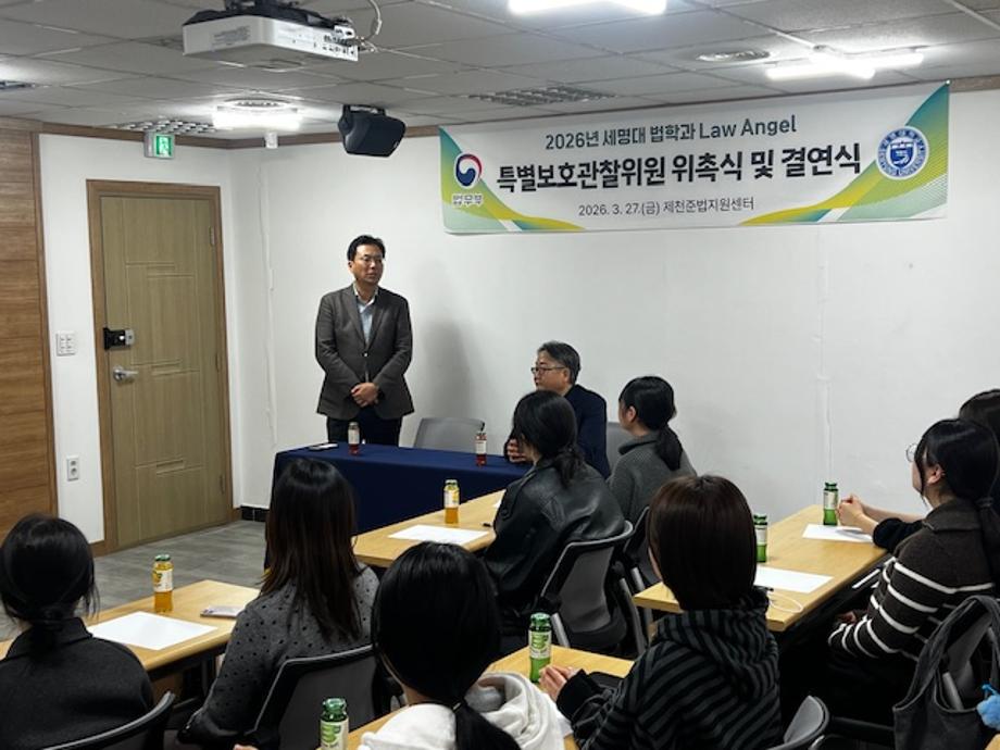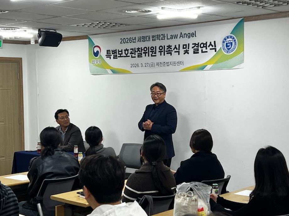 본문 시작 홈으로 커뮤니티 학과안내 교수소개 학과과정 커뮤니티 홈페이지가이드 학과사진첩 공지사항 취업정보 학과사진첩 학과행사 동아리 학생회 교우소식 학과사진첩 페이스북 트위터 프린트 2026. 03. 27. Law Angel 위촉식 법학과 77 2026-04-01 지난 3월 27(금) 15:30에 제천보호관찰소에서 로엔젤 학생들이 특별보호관찰위원 위촉식을 진행하였습니다. 목록 이전겨울방학 해외 배낭여행-푸꾸옥 담당부서 : 법학과 담당자 : - 연락처 : 043-649-1764 최종수정일 : 2024-10-26 만족도조사 만족도 조사 이 페이지에서 제공하는 정보에 대하여 만족하시나요? 매우만족 만족 보통 불만족 매우불만족