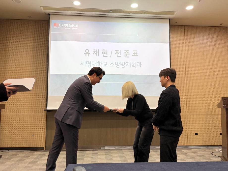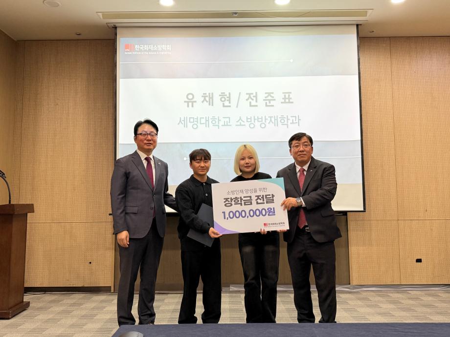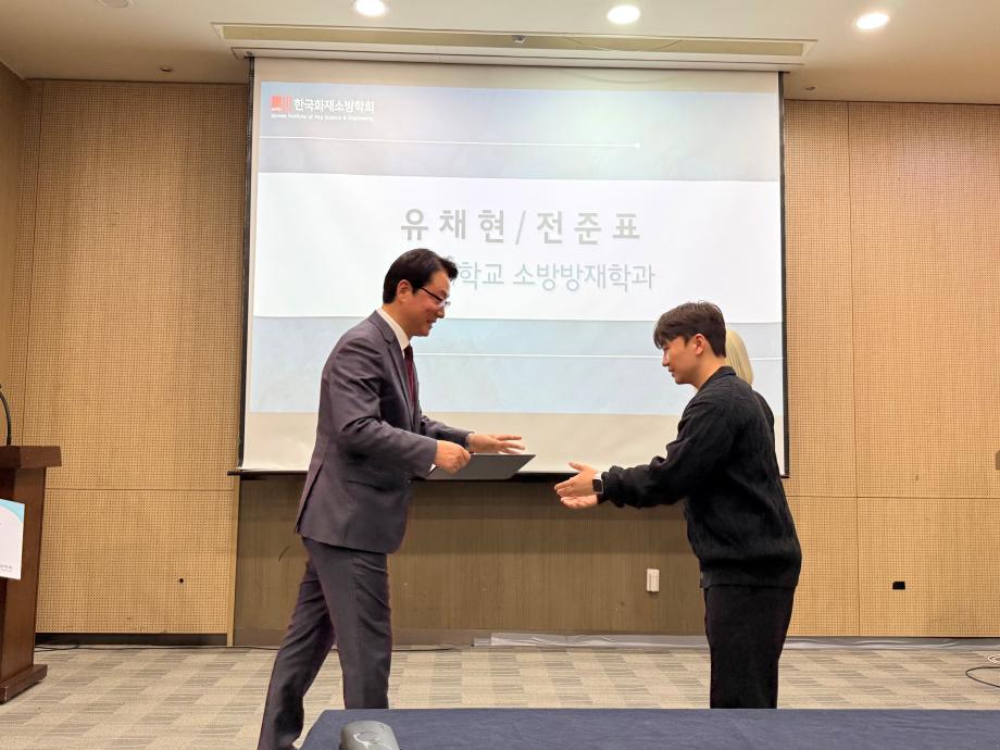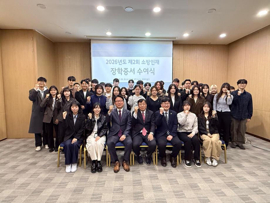 본문 시작 홈으로 커뮤니티 학과소개 교수소개 전공과정 커뮤니티 홈페이지가이드 학과행사 학과공지 채용정보 학사일정 학과행사 학생회 동아리 소방방재학과의 자랑 궁금합니다 수험생 Q&A 학과행사 페이스북 트위터 프린트 2026학년도 제2회 소방인재 장학증서 수여식 소방방재학과 57 2026-04-23 2026년 3월 25일 수요일 2026학년도 제2회 소방인재 장학증서 수여식이 진행되었습니다. 우리 학과에서는 21학번 전준표, 23학번 유채현 학생이 한국소방학회 장학생으로 선정되어 장학금을 수여하였습니다. 목록 이전2026학년도 소방방재학과 MT 이전캡스톤디자인 작품 중앙시장 번영회에 기증 담당부서 : 소방방재학과 담당자 : - 연락처 : 043-649-1787 최종수정일 : 2024-10-26 만족도조사 만족도 조사 이 페이지에서 제공하는 정보에 대하여 만족하시나요? 매우만족 만족 보통 불만족 매우불만족