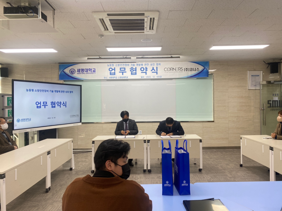 (주) 코너스 mou 와 세명대학교 소방방재학과(학과장 정해영) 업무 협약식에는 (주) 코너스 대표님께서 직접 참석하셨습니다.