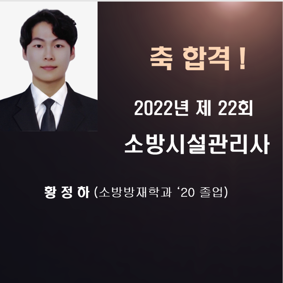 2022년 제22회 소방시설 관리사에 유제성('20졸업), 황정하( '20졸업) 졸업생이 최종 합격하였습니다.