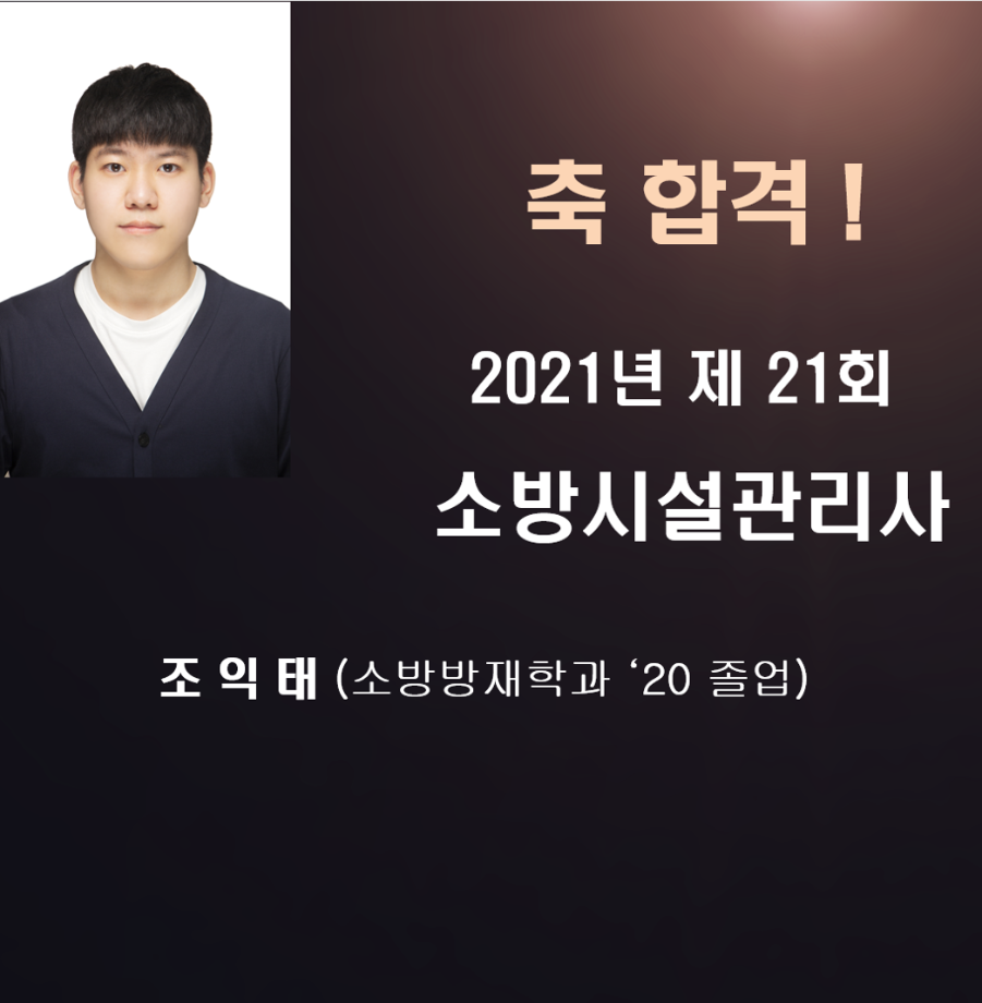 2021년도 제 21회 소방시설관리사 시험에 합격한 조익태('20졸업) 졸업생에 이어