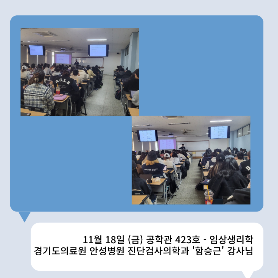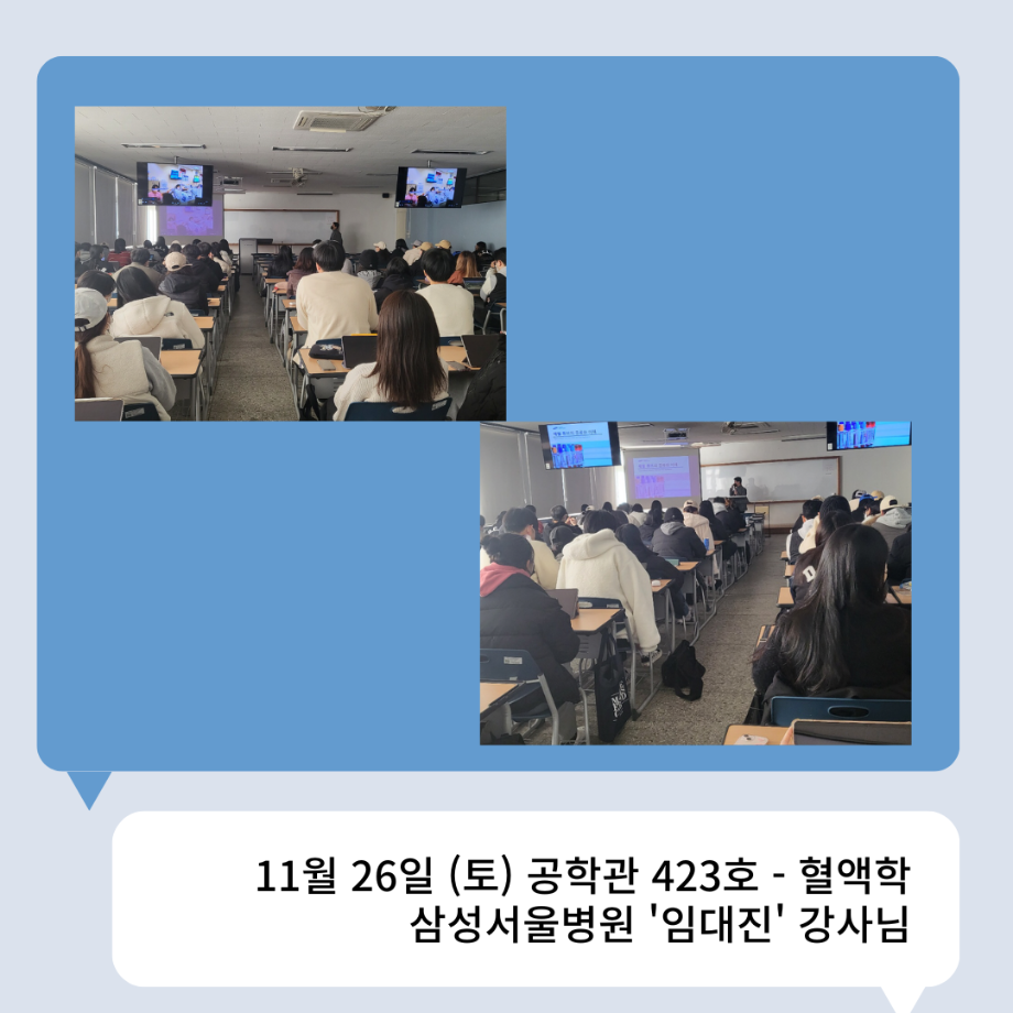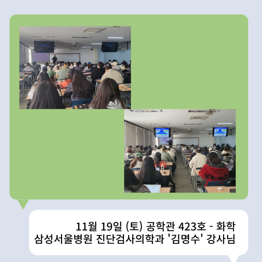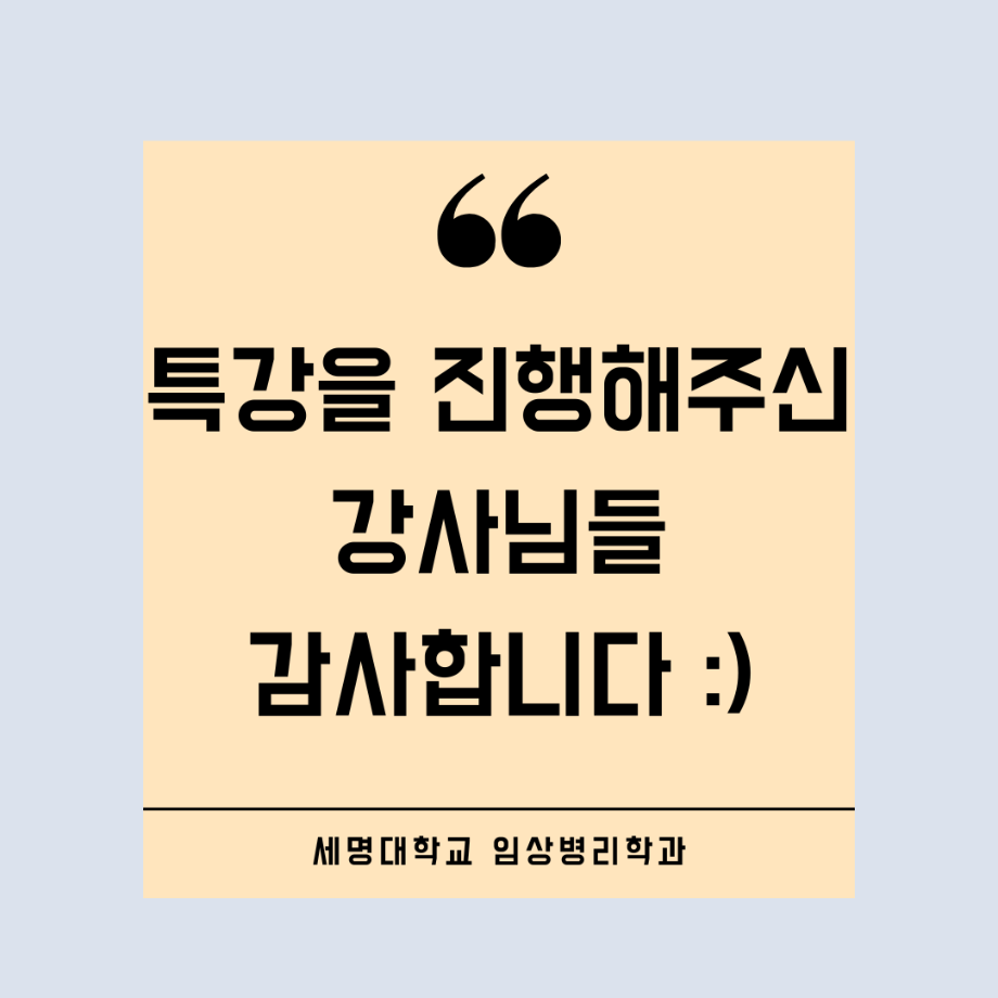 본문 시작 👨🔬2022년 3학년 실습특강👨🔬 임상병리학과 7036 2023-01-16 2022년 3학년 병원 실습 특강을 대신하여 각 분야의 강사님들을 초빙하여 강의를 진행해 주셨습니다. 병원실습을 못 간 대신 병원과 취업에 대해 궁금한 것에 대해 질문도 하는 유익한 시간이었습니다~ ✨ 강의를 진행해 주신 강사님들 감사합니다 🙂 ✨ 목록 이전🤖 3학년 세균학및실험 수업 실습영상 🤖 - 3주차 다음 2022 임상병리학과 MT 담당부서 : 임상병리학과 담당자 : - 연락처 : 043-649-1537 최종수정일 : 2024-10-26 만족도조사 만족도 조사 이 페이지에서 제공하는 정보에 대하여 만족하시나요? 매우만족 만족 보통 불만족 매우불만족