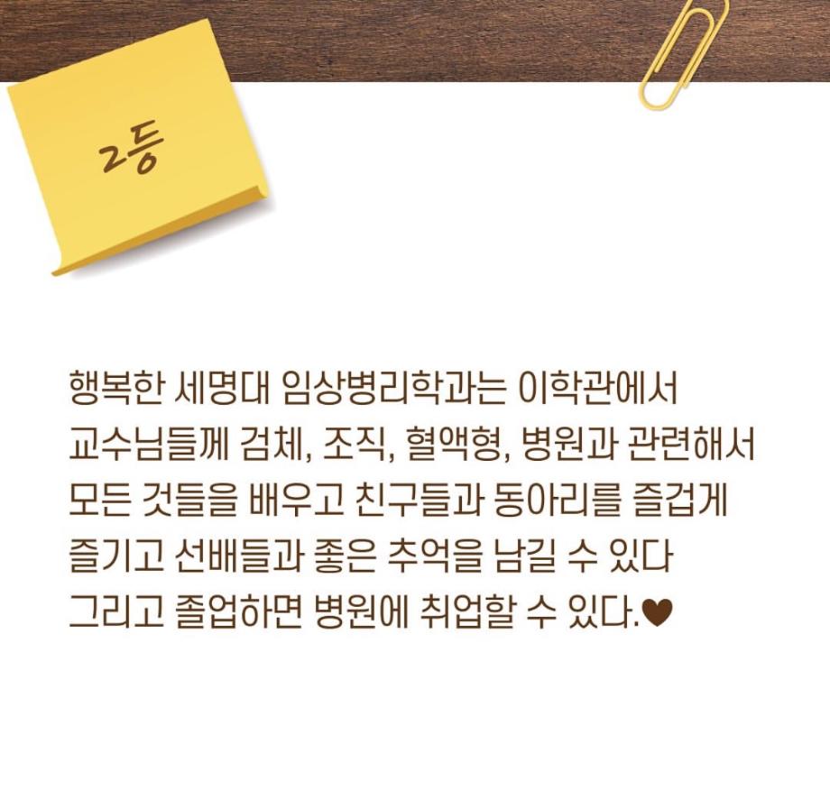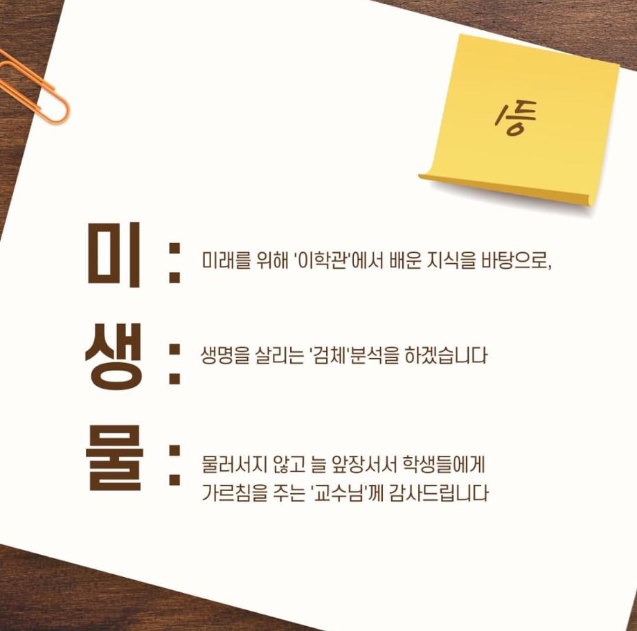 본문 시작 9월 학과 문장만들기 임상병리학과 2314 2024-10-03 9월 학과 개설된 달 기념 3행시, 문장 만들기 이벤트 우수작 총 15개를 선정하였지만 사진 제한이 있어 다 올리지는 못하였습니다 ! 상품은 다음 주 중으로 증정해 드릴 예정입니다 :) 이번 이벤트에 많은 관심을 가져주셔서 감사합니다. 다음에도 좋은 이벤트가 기다리고 있으니 기대해주시길 바랍니다 ! 목록 이전헌혈 버스 다음 중간고사 학용품 이벤트 담당부서 : 임상병리학과 담당자 : - 연락처 : 043-649-1537 최종수정일 : 2024-10-26 만족도조사 만족도 조사 이 페이지에서 제공하는 정보에 대하여 만족하시나요? 매우만족 만족 보통 불만족 매우불만족