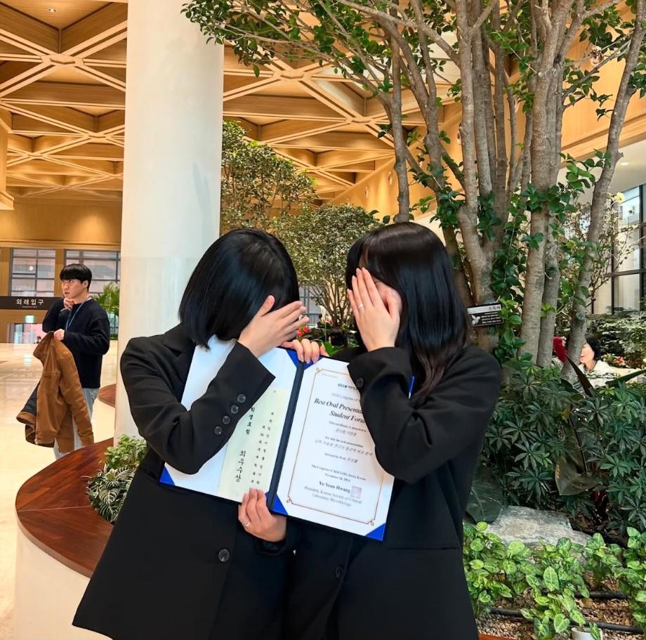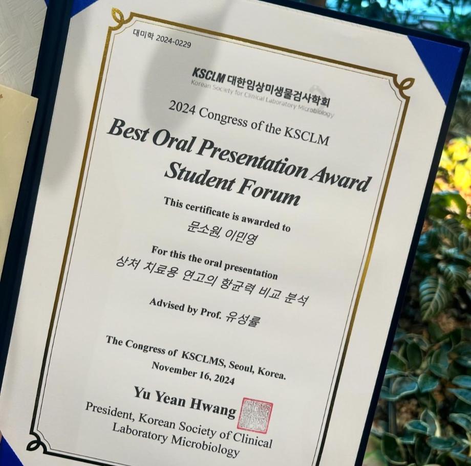본문 시작 KSCLM 대한미생물검사학회 최우수상 임상병리학과 3238 2024-11-21 세명대학교 임상병리학과 이민영,문소원 학생이 지난 11월 16일 KSCLM 대한미생물검사학괴에서 '상처 치료제의 항균력 비교 분석' 이라는 주제로 발표하여 최우수상을 수상하였습니다. 앞으로도 많은 학생이 다양한 행사와 연구에 참여하여 많은 성과를 얻어갔으면 합니다! 다시 한번 수상을 진심으로 축하합니다 !! 목록 다음 헌혈 버스 오는 날 이전졸업 선물 이벤트 담당부서 : 임상병리학과 담당자 : - 연락처 : 043-649-1537 최종수정일 : 2024-10-26 만족도조사 만족도 조사 이 페이지에서 제공하는 정보에 대하여 만족하시나요? 매우만족 만족 보통 불만족 매우불만족