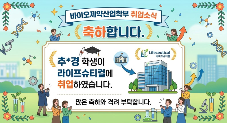 본문 시작 홈으로 학부자료실 학부소개 교육과정 학부공지게시판 학부자료실 홈페이지가이드 학부행사 및 사진게시판 학부행사 및 사진게시판 학생회 소개 학부행사 및 사진게시판 페이스북 트위터 프린트 축하합니다. 추*경 학생이 라이프 슈티컬에 취업하였습니다. 바이오제약산업학부 26 2026-04-27 축하합니다. 추*경 학생이 라이프 슈티컬에 취업하였습니다. 목록 이전GC-MS 기기 활용 활동 다음 축하합니다. 이*서 학생이 시마즈사이언티픽코리아에 취업하였습니다. 담당부서 : 바이오제약산업학부 담당자 : - 연락처 : 043-649-1729 최종수정일 : 2024-10-26 만족도조사 만족도 조사 이 페이지에서 제공하는 정보에 대하여 만족하시나요? 매우만족 만족 보통 불만족 매우불만족