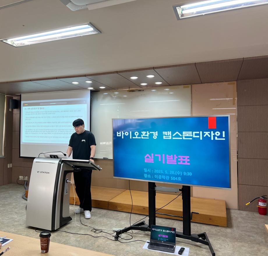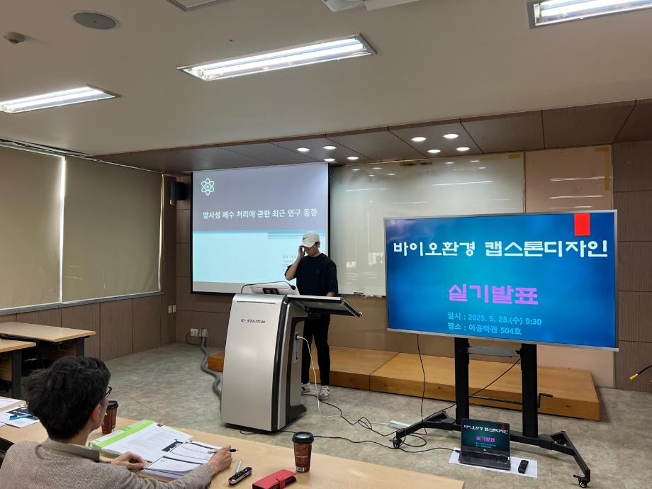 본문 시작 홈으로 커뮤니티 학과소개 교수소개 학과과정 커뮤니티 홈페이지가이드 학과활동 및 행사 학과공지 채용정보 학과활동 및 행사 전공자료실 동아리 학과활동 및 행사 페이스북 트위터 프린트 2025학년도 바이오환경공학과(환경에너지학과) 캡스톤디자인 최종발표회 개최 환경에너지학과 1425 2025-05-28 4학년 졸업논문과 연계한 '바이오환경캡스톤디자인' 최종 발표회가 개최되었습니다. 1. 일시 : 2025.05.28.(수). 9:30 2. 장소 : 이공학관 504호 학과 지도교수님의 지도로 총 2개팀의 발표와 질의응답이 있었습니다. 발표의 주제는 다음과 같습니다. 1) 방사성 폐수 처리에 관한 최근 연구 동향 (지도교수 : 최석순) 2) 국내 환경분야의 딥러닝 기법 적용 사례조사 (지도교수 : 윤석표) 한 학기 동안 졸업논문 발표 준비한 4학년 학생들과 지도교수님 모두 수고 많으셨습니다. 목록 이전환경에너지학과/재난안전학과 단체 봉사 실시 다음 바이오환경실무체험 학술특강 1차 실시 담당부서 : 환경에너지학과 담당자 : - 연락처 : 043-649-1337 최종수정일 : 2024-10-26 만족도조사 만족도 조사 이 페이지에서 제공하는 정보에 대하여 만족하시나요? 매우만족 만족 보통 불만족 매우불만족