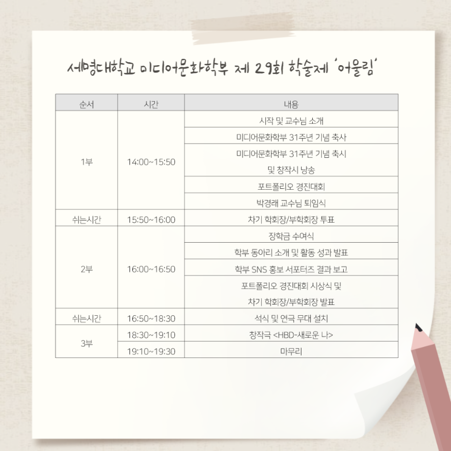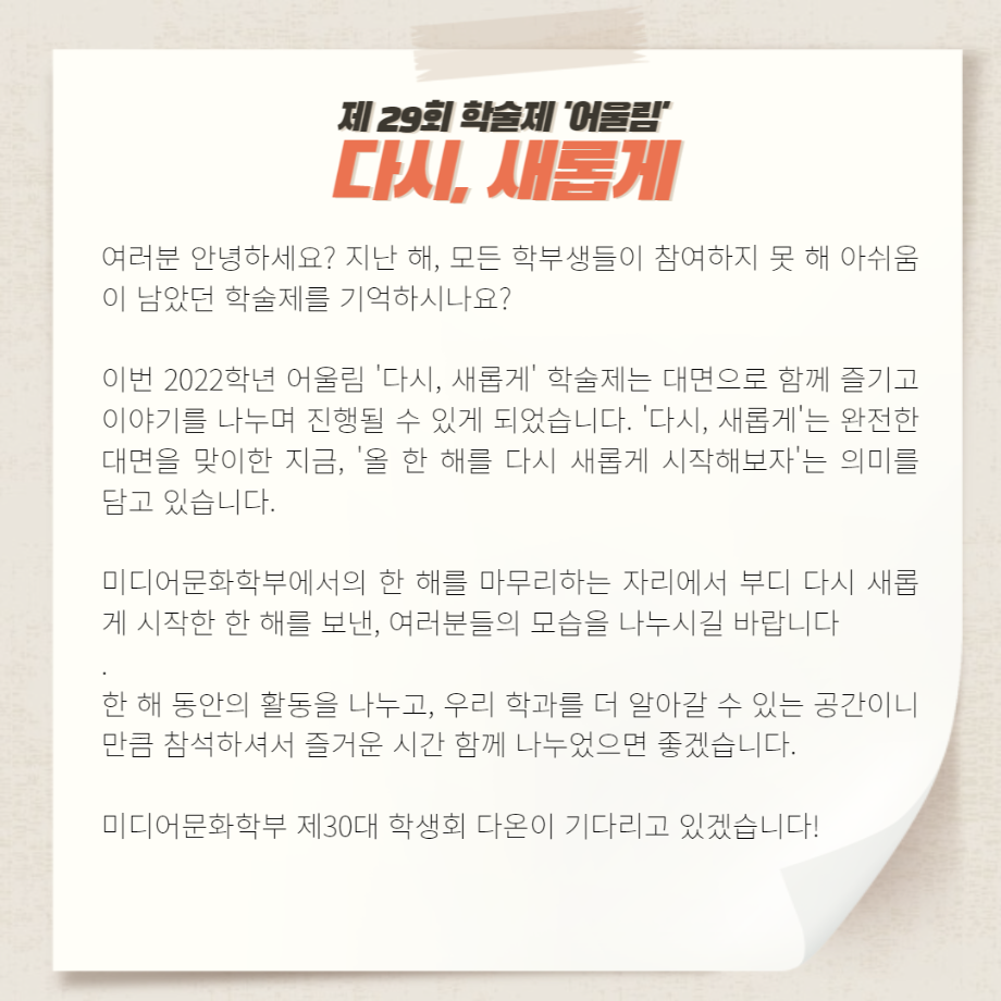 본문 시작 홈으로 학부소식 학부소개 교육과정 학부소식 커뮤니티 홈페이지가이드 학부행사 공지사항 학사일정 학부행사 미문뉴스 미문한컷 포토갤러리 학부행사 페이스북 트위터 프린트 미디어문화학부 학술제 어울림 '다시, 새롭게' 미디어문화학부 3528 2022-11-16 11월 23일 (수) 14:00 학술관 112호에서 미디어문화학부의 가장 큰 행사인 학술제 어울림 '다시, 새롭게'를 진행합니다. 포트폴리오 경진대회, 창작시 낭송, 창작극 그리고 차기 학회장/부학회장 발표도 있을 예정입니다! 🫶 오랜만에 모든 학우분들과 함께하는 대면 행사이기에 많은 참여 및 관심 부탁드립니다! 목록 이전교내외 공모전 안내 다음 미디어문화학부 학술제 어울림 '다시, 새롭게' 담당부서 : 미디어문화학부 담당자 : - 연락처 : 043-649-1760 최종수정일 : 2024-10-26 만족도조사 만족도 조사 이 페이지에서 제공하는 정보에 대하여 만족하시나요? 매우만족 만족 보통 불만족 매우불만족