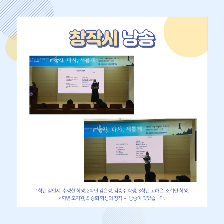 오지혜 교수님의 축사, 이창식 교수님의 축시인 <겨울철 오징어게임>과 더불어 1~4학년의 창작시 낭송이 있었습니다! 그리고 학부생들이 열심히 노력한 결과를 발표하는 포트폴리오 경진대회 및 시상식을 진행했습니다. 올해 퇴임을 하시는 박경래 교수님의 퇴임식도 간단히 진행되었습니다🎉 이후 동아리 소개 및 활동성과 발표, 교수 추천 장학금 시상식, 다음 연도를 이끌어 갈 차기 학회장/부학회장 발표가 있었습니다. 마지막으로는 창작극 <HBD-새로운 나>의 발표가 있었습니다🫶