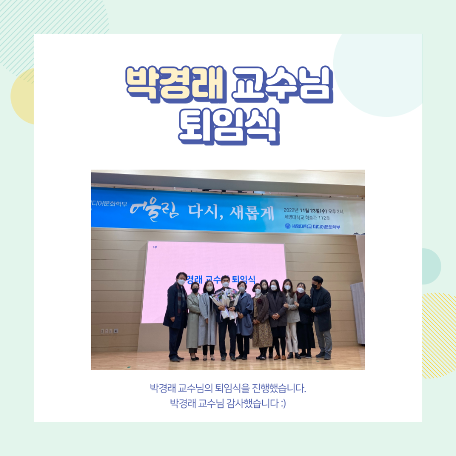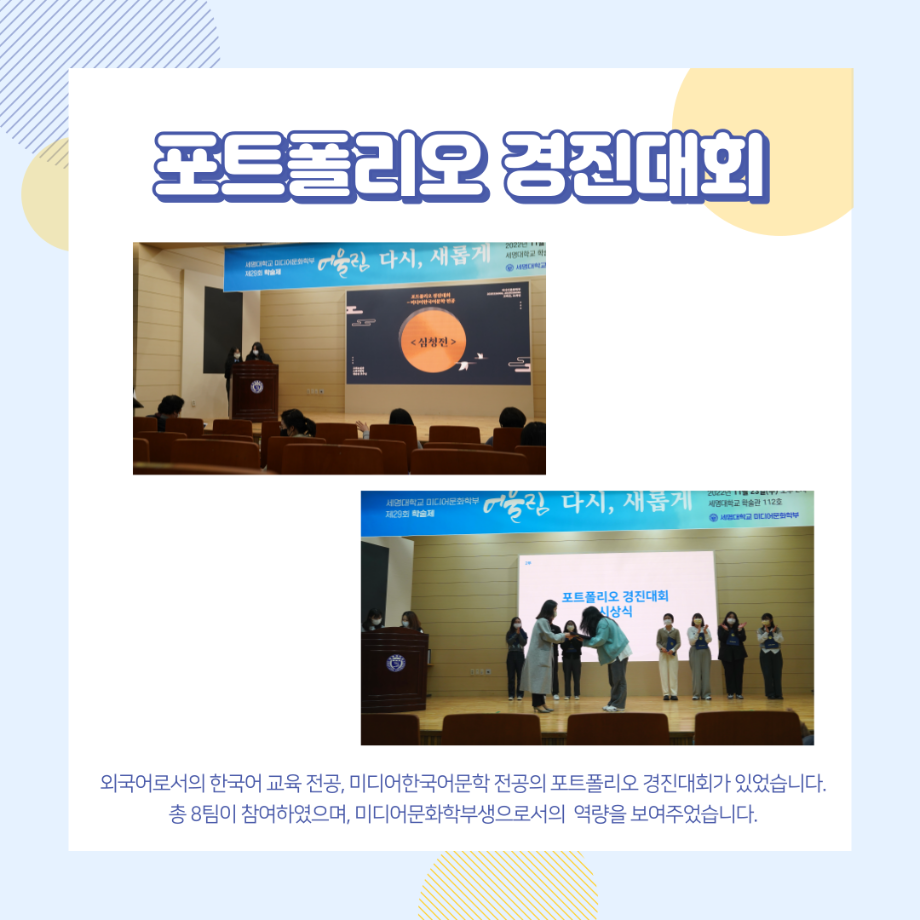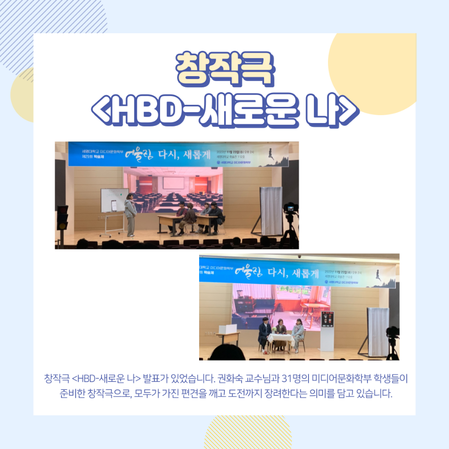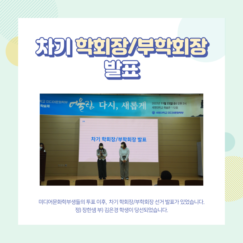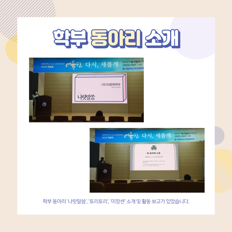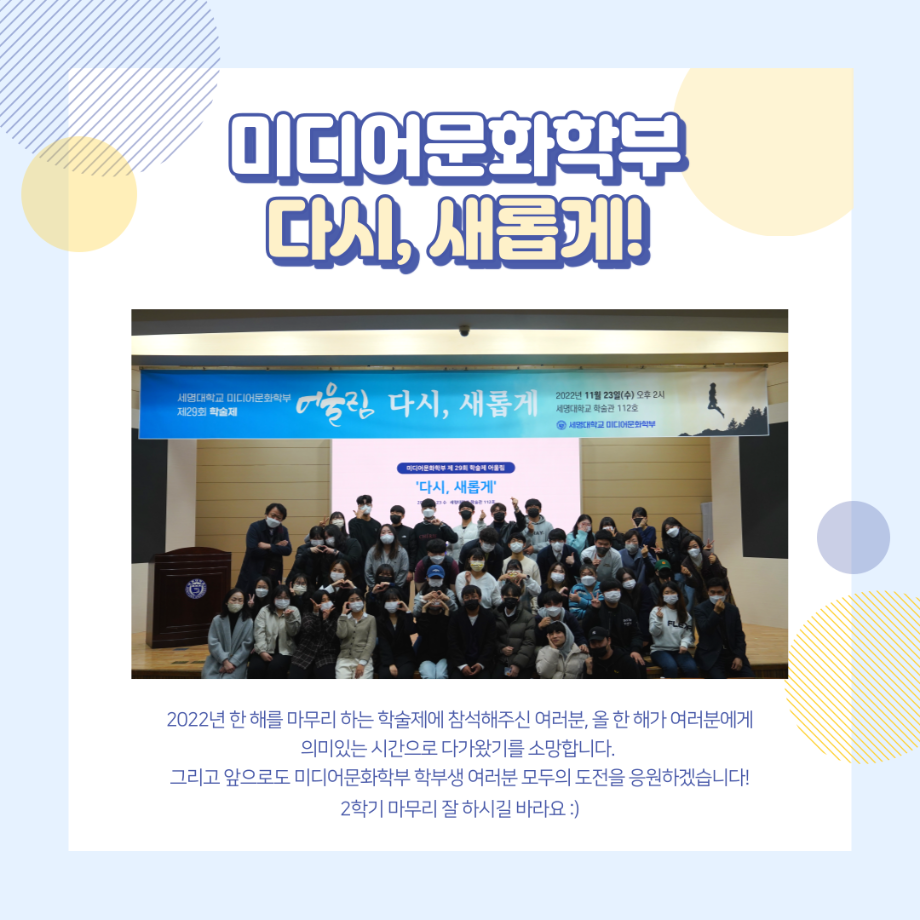 지난 11월 23일 (수) 14:00 학술관 112호에서 진행했던 미디어문화학부의 가장 큰 행사인 학술제 어울림 '다시, 새롭게' 결과 보고 카드뉴스 올려드려요🙂