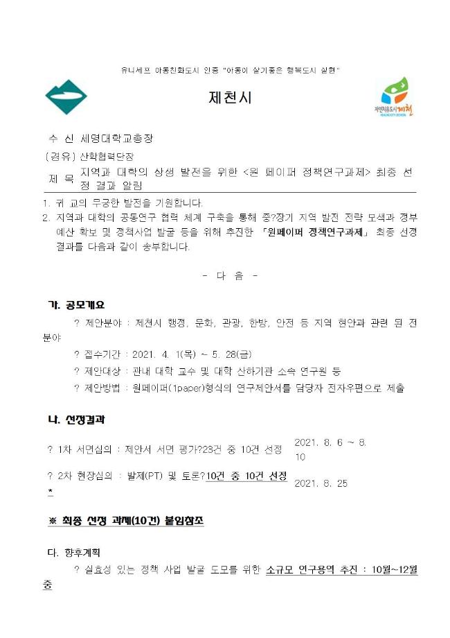 제천시 원페이퍼 정책연구과제 공모 최종선정 결과