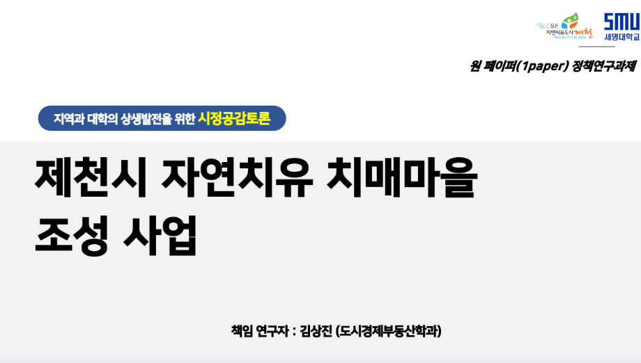 2021년 9월 15일 정부 예산 확보 및 정책사업 발굴을 목표로 지역과 대학의 상생발전 연구협력체계 구축을 위한 '제천시 원 페이퍼(1paper) 정책 연구과제 공모를 통한 김상진 교수님의 '제천시 자연치유 치매 마을 조성 사업'과 백민석 교수님의 '제천시 주택 공급 계획'이 최종 선정되었습니다.