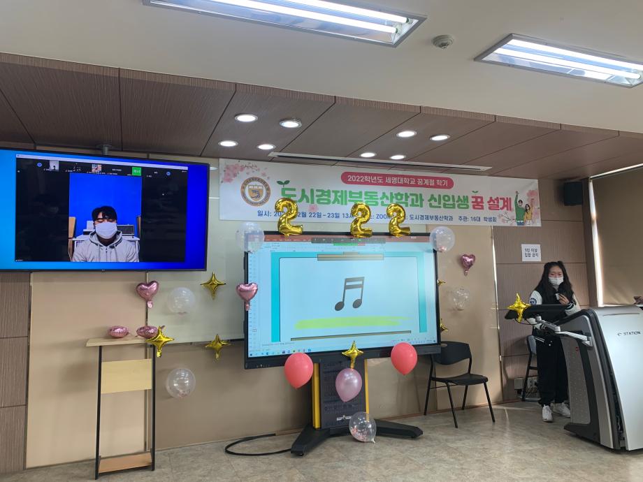 지난 2월22일 도시경제부동산학과 신입생들을 대상으로 꿈 설계학기 프로그램을 진행했습니다. 실시간 ZOOM으로 비대면 행사를 진행했지만 신입생들은 모두 참여해주었습니다. 학생들은 자기소개와 함께 장기자랑으로 자신을 뽐내며 22학번의 저력을 보여주었습니다. ^^