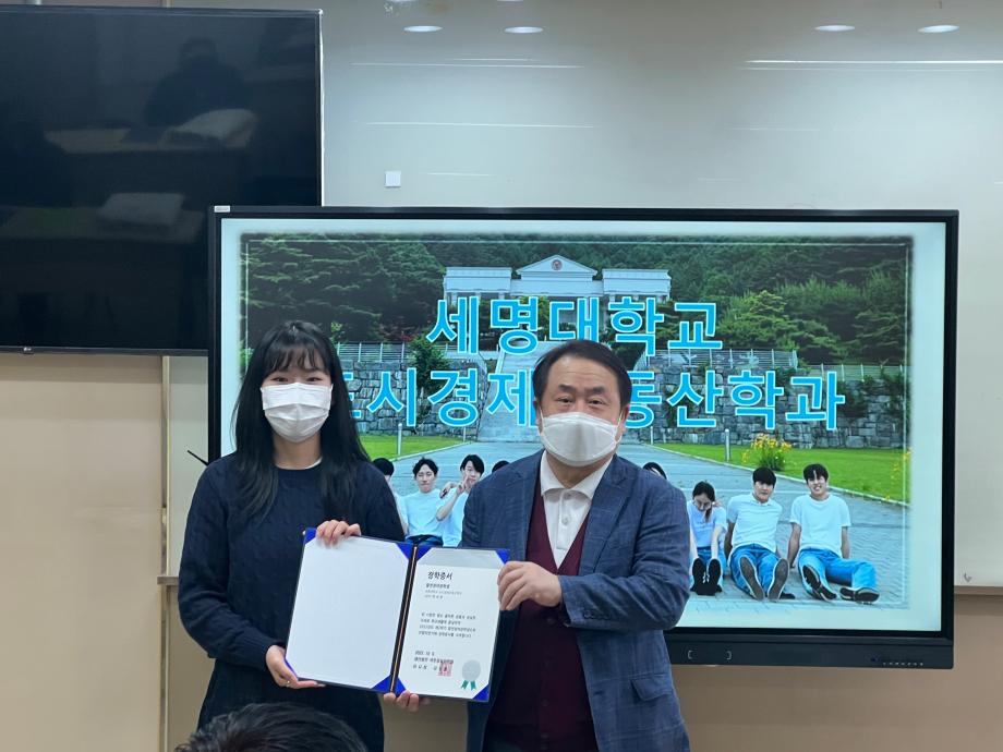 또한 한국국토정보공사에서 발전장려장학금을 지원하여 도시경제부동산학과 3학년 박지연학생이 장학증서를 수여받았습니다.