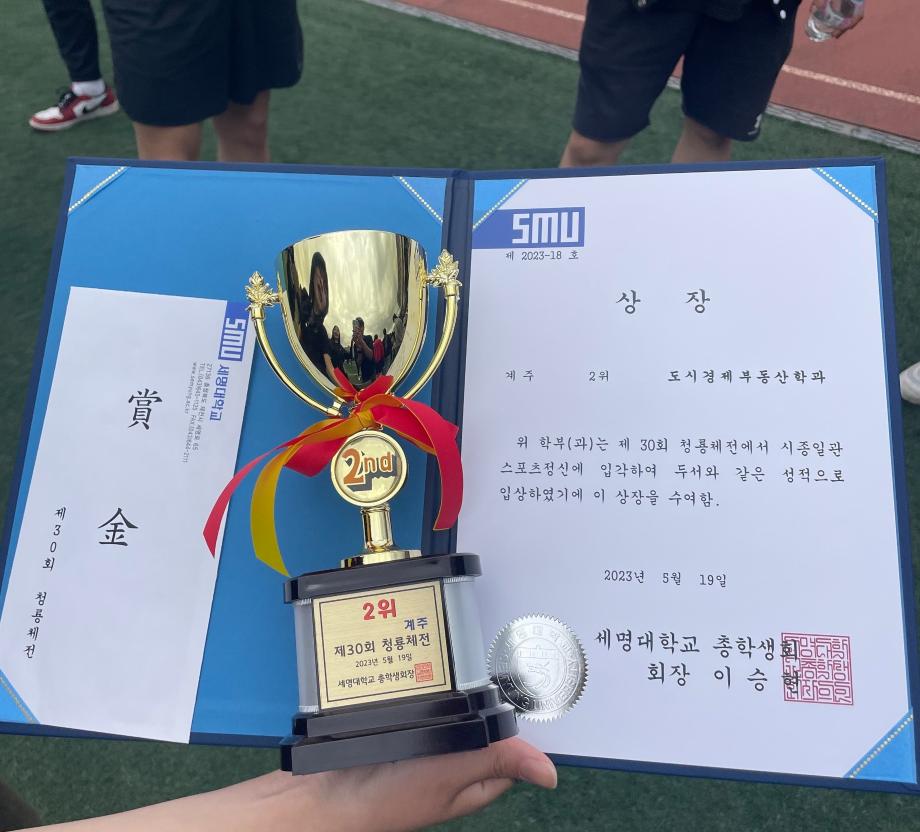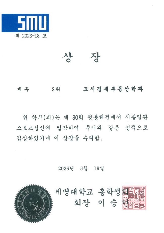 5.17일 부터 19일까지 진행된 청룡체전이 무사히 마쳤습니다. 학생들의 적극적인 참여로 발야구, 축구, 줄다리기,계주, 달리기에 참여하여 줄다리기 1등 , 계주 2등을 수상하였습니다. 참여해주신 교수님과 학생 여러분 너무 감사하고 수고하셨습니다.