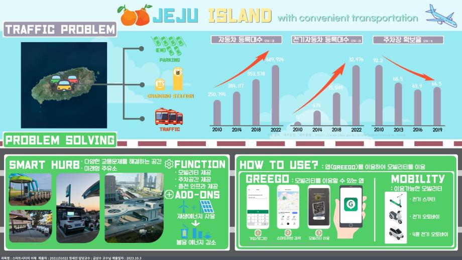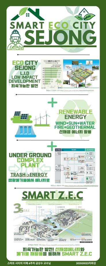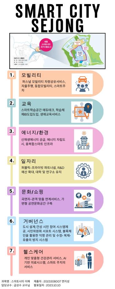 스마트 도시로서의 형성과정과 스마트시티에서 일어나는 다양한 요소들에 대한 내용을 이해하고 스마트시티와 관련된 국내도시를 하나의 인포그라피로 표현할 수 있는 능력에 대하여 학습함으로 스마트도시를 이해합니다.