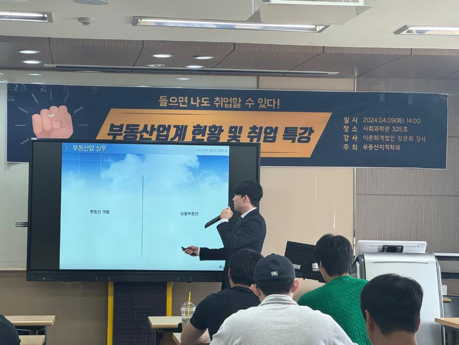 내용 : 이촌회계법인 강문희 강사님은부동산자산관리실무체험 에 특강을 해주셨습니다. 학교에서 배우기 어려운 부동산업계 현황 및 취업특강을 구체적으로 설명을 해주셨습니다. 학생들은 부동산분야의 진로에 깊이 고민하고 답을 얻는 시간이였다고 생각합니다.
