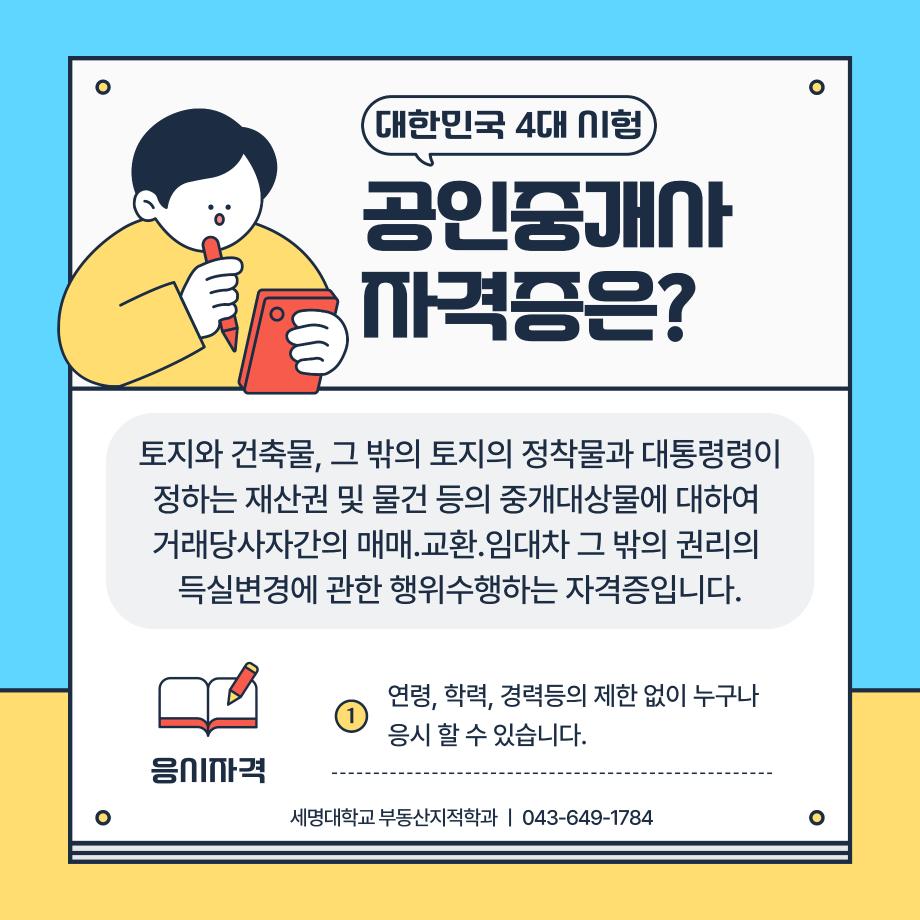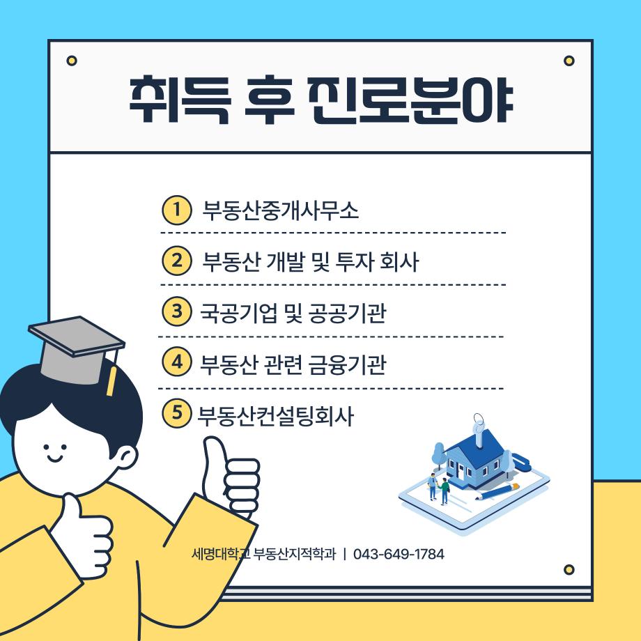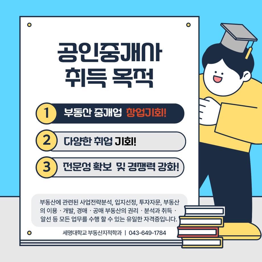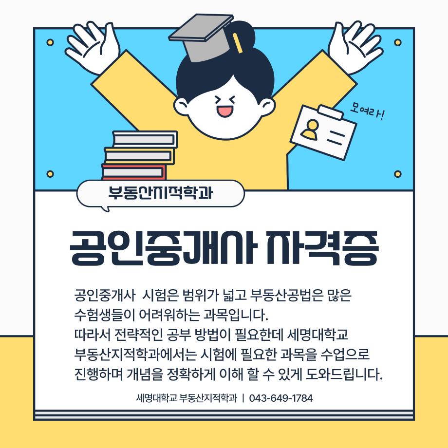 본문 시작 홈으로 학과 소식 학과소개 취업 및 진로 언론 및 보도 학과 소식 대학원 홈페이지가이드 행사사진게시판 행사사진게시판 공지사항 일반자료실 강의자료실 부동산학보 동아리 행사사진게시판 페이스북 트위터 프린트 공인중개사 소개카드 부동산지적학과 2335 2024-11-20 공인중개사 소개 카드입니다. 공인중개사에 관심있는 학생들은 참고하여 주세요. 목록 이전2024학년도 제 35회 부동산지적학과 학술특강 다음 지적기사 소개 카드 담당부서 : 부동산지적학과 담당자 : - 연락처 : 043-649-1784 최종수정일 : 2024-10-26 만족도조사 만족도 조사 이 페이지에서 제공하는 정보에 대하여 만족하시나요? 매우만족 만족 보통 불만족 매우불만족