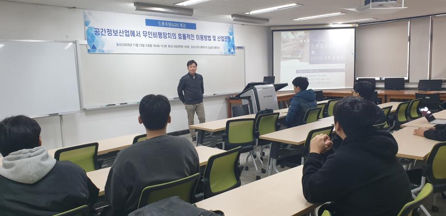 이번 특강을 통해 학생들은 드론을 활용한 영상정보 구축의 전반적인 흐름을 이해하게 되었으며, 영상 촬영부터 데이터 처리, 지도 제작과 3D 모델링에 이르기까지 드론 기술의 실제 활용 가치를 폭넓게 체감할 수 있었습니다. 또한 농업, 측량, 재해관리 등 다양한 분야의 사례를 접하면서 드론 데이터가 실무에서 어떻게 활용되는지에 대한 인식이 높아졌고, 이를 통해 드론·공간정보 분야에 대한 관심과 진로 탐색의 동기도 강화되었습니다. 최신 기술 동향과 산업 전망을 이해함으로써 관련 분야에 대한 학습 의욕도 향상되는 효과가 있었습니다.