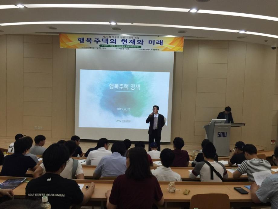 부동산학과(학과장 권기욱 교수)는 2015년 6월 11일(목) 세명대학교 학술관 102호에서 국토교통부 행복주택정책과 이상욱 사무관을 초빙하여 “행복주택 현재와 미래”란 주제로 특강을 실시하였다.
