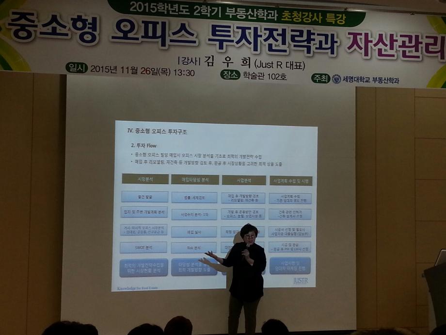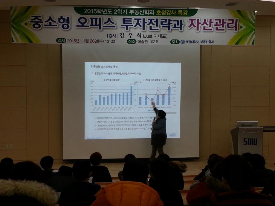 세명대학교 부동산학과(학과장 권기욱 교수)는 2015년 11월26일(목) 세명대학교 학술관 102호에서 부동산업계 대표적인 ㈜ Just R 김우희 대표이사를 모시고 “중소형 오피스 투자전략과 자산관리”란 주제로 특강을 실시하였다. 현장에서 살아 있는 특강을 한 김우희 대표는 우리나라 부동산 시장의 변화에서 중소형 오피스 투자에 대한 넓은 식견으로 자산관리를 어떻게 하는지를 강조하였다. 뿐만 아니라 세명대 부동산학과 학생들에게 사회진출에 대한 자신감을 불어 넣어주면서 즉석에서 인턴채용을 약속하여 학생들로부터 많은 박수를 받기도 하였다. 특강 후 현장감 있는 강의 내용에 대하여 많은 학생들의 질문이 잇따르면서 어느 때 보다 열정적이었으며 취업에 대한 간절함을 가지고 자신 있게 사회로 첫발을 과감히 내딛으라는 격려 속에 특강은 마무리 되었다. 앞으로 부동산학과는 이러한 특강을 지속적으로 개최하여 부동산학과 학생들의 생동감 있는 사회인을 양성하는데 도움을 주고자 한다.
