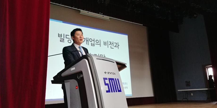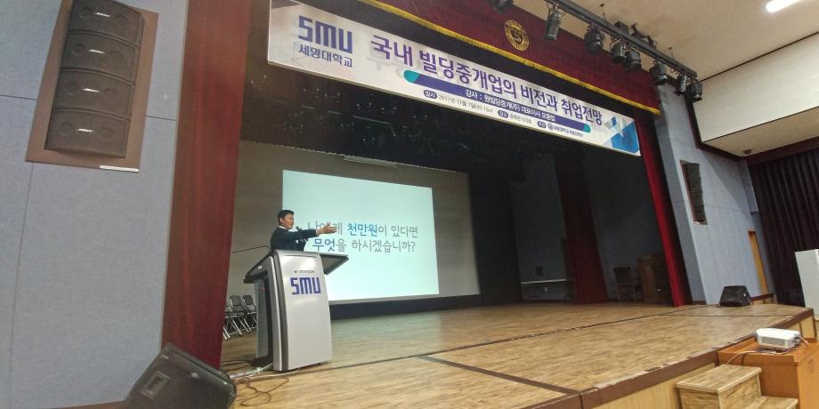 세명대학교 부동산학과(학과장 백민석 교수)는 11월1일 수요일 세명대학교 공학관 512호에서 원빌딩부동산중개㈜ 오동협 대표이사를 초청하여 “국내 빌딩중개업의 비전과 취업전망”란 주제로 특강을 실시하였습니다. 현직자의 강연을 통하여 부동산학과 재학생들이 실제 부동산과 관련한 중개업의 실무와 경제적 지식에 대한 강연을 듣고 부동산 시장의 상황을 이해하고 차후 관련 업계로 직업을 탐구할 수 있는 기회가 마련되었습니다.