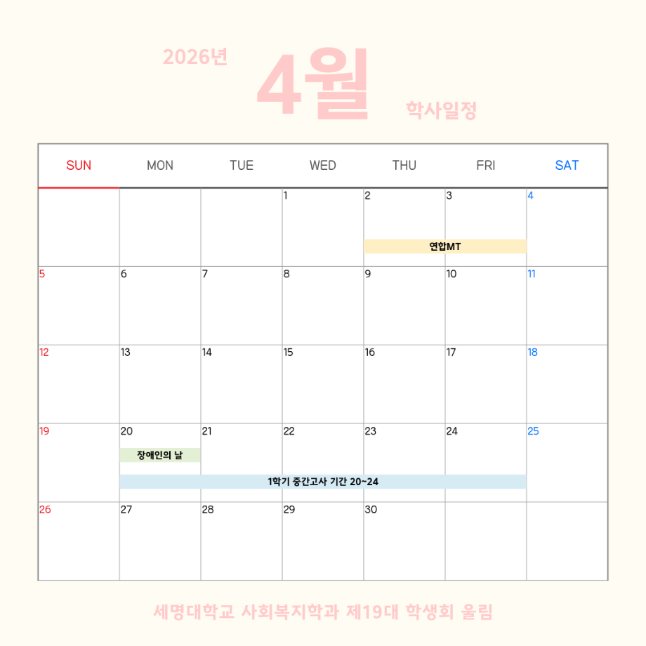 본문 시작 홈으로 커뮤니티 학과소개 교수소개 교육과정 현장실습 및 취업정보 커뮤니티 홈페이지가이드 학사일정 학과공지 학사일정 학생회 동아리 학생 소통 광장 포토갤러리 전공자료실 서식자료실 학사일정 페이스북 트위터 프린트 4월 학사 일정 사회복지학과 3 2026-04-06 4월 학사 일정입니다. 목록 이전3월 학사 일정 담당부서 : 사회복지학과 담당자 : - 연락처 : 043-649-1799 최종수정일 : 2024-10-26 만족도조사 만족도 조사 이 페이지에서 제공하는 정보에 대하여 만족하시나요? 매우만족 만족 보통 불만족 매우불만족
