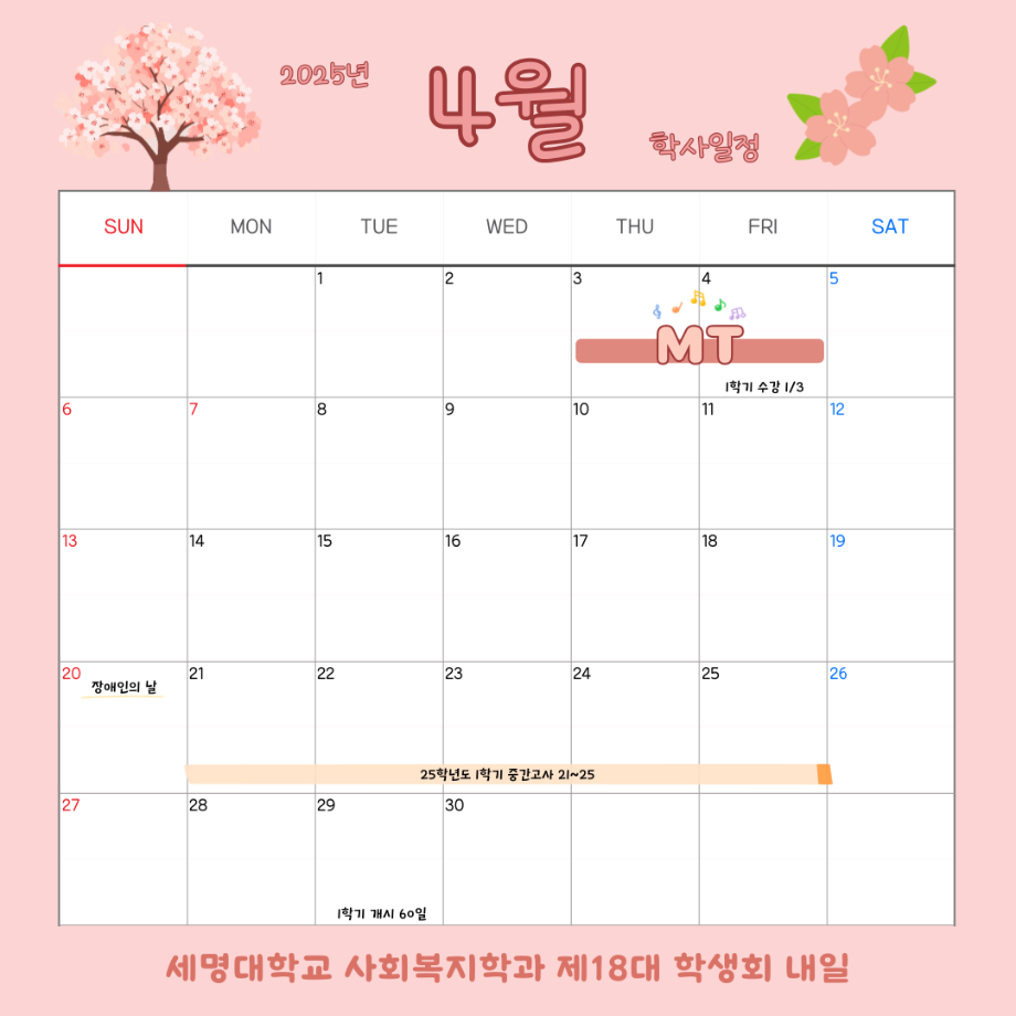 본문 시작 홈으로 커뮤니티 학과소개 교수소개 교육과정 현장실습 및 취업정보 커뮤니티 홈페이지가이드 학사일정 학과공지 학사일정 학생회 동아리 학생 소통 광장 포토갤러리 전공자료실 서식자료실 학사일정 페이스북 트위터 프린트 4월 학사 일정 사회복지학과 856 2025-09-04 2025학년도 4월 학사 일정입니다. 목록 이전3월 학사 일정 다음 5월 학사 일정 담당부서 : 사회복지학과 담당자 : - 연락처 : 043-649-1799 최종수정일 : 2024-10-26 만족도조사 만족도 조사 이 페이지에서 제공하는 정보에 대하여 만족하시나요? 매우만족 만족 보통 불만족 매우불만족