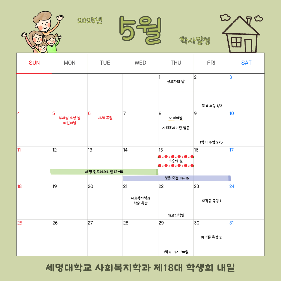 본문 시작 홈으로 커뮤니티 학과소개 교수소개 교육과정 현장실습 및 취업정보 커뮤니티 홈페이지가이드 학사일정 학과공지 학사일정 학생회 동아리 학생 소통 광장 포토갤러리 전공자료실 서식자료실 학사일정 페이스북 트위터 프린트 5월 학사 일정 사회복지학과 797 2025-09-04 2025학년도 5월 학사 일정입니다. 목록 이전4월 학사 일정 다음 6월 학사 일정 담당부서 : 사회복지학과 담당자 : - 연락처 : 043-649-1799 최종수정일 : 2024-10-26 만족도조사 만족도 조사 이 페이지에서 제공하는 정보에 대하여 만족하시나요? 매우만족 만족 보통 불만족 매우불만족