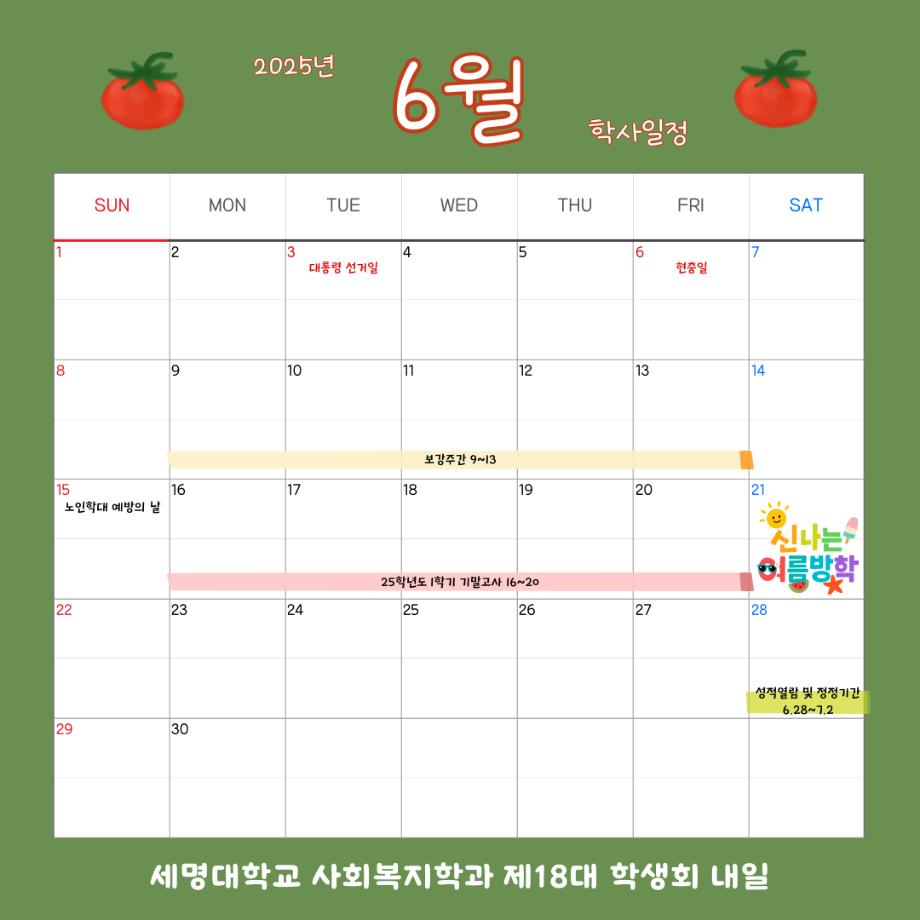 본문 시작 홈으로 커뮤니티 학과소개 교수소개 교육과정 현장실습 및 취업정보 커뮤니티 홈페이지가이드 학사일정 학과공지 학사일정 학생회 동아리 학생 소통 광장 포토갤러리 전공자료실 서식자료실 학사일정 페이스북 트위터 프린트 6월 학사 일정 사회복지학과 808 2025-09-04 2025학년도 6월 학사 일정입니다. 목록 이전5월 학사 일정 다음 8월 학사 일정 담당부서 : 사회복지학과 담당자 : - 연락처 : 043-649-1799 최종수정일 : 2024-10-26 만족도조사 만족도 조사 이 페이지에서 제공하는 정보에 대하여 만족하시나요? 매우만족 만족 보통 불만족 매우불만족
