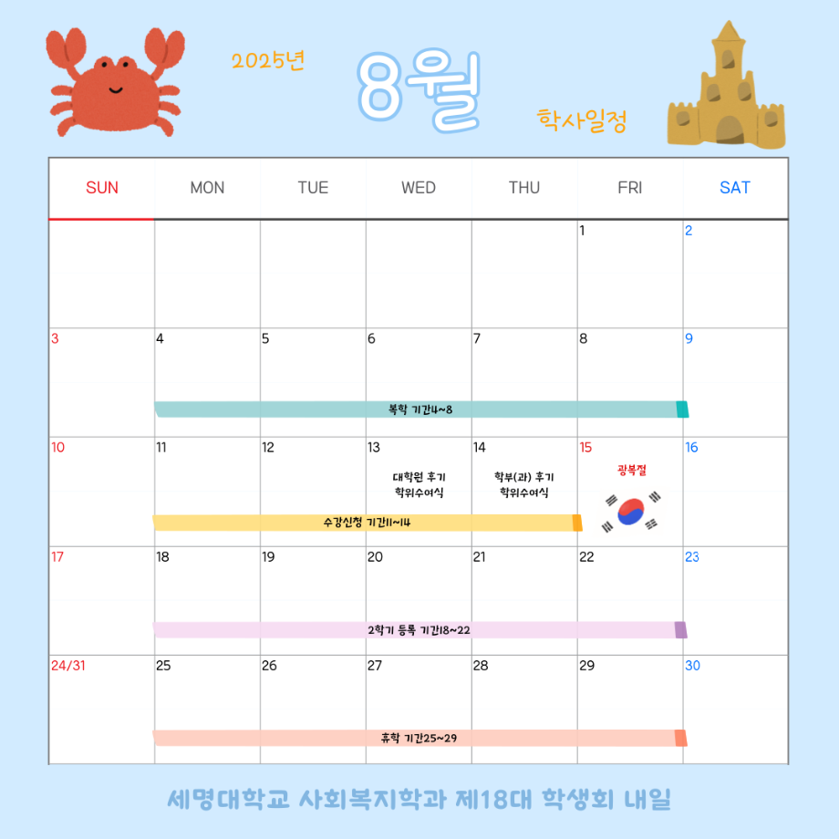 본문 시작 홈으로 커뮤니티 학과소개 교수소개 교육과정 현장실습 및 취업정보 커뮤니티 홈페이지가이드 학사일정 학과공지 학사일정 학생회 동아리 학생 소통 광장 포토갤러리 전공자료실 서식자료실 학사일정 페이스북 트위터 프린트 8월 학사 일정 사회복지학과 905 2025-09-04 2025학년도 8월 학사 일정입니다. 목록 이전6월 학사 일정 다음 9월 학사 일정 담당부서 : 사회복지학과 담당자 : - 연락처 : 043-649-1799 최종수정일 : 2024-10-26 만족도조사 만족도 조사 이 페이지에서 제공하는 정보에 대하여 만족하시나요? 매우만족 만족 보통 불만족 매우불만족