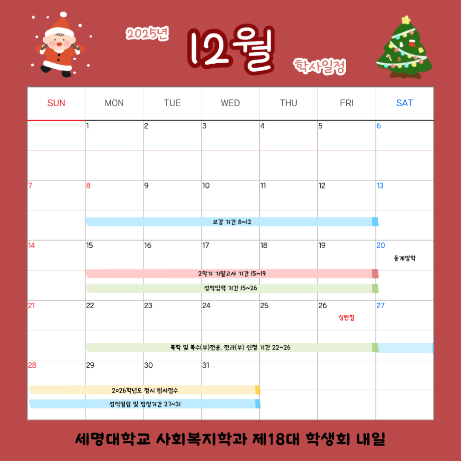 본문 시작 홈으로 커뮤니티 학과소개 교수소개 교육과정 현장실습 및 취업정보 커뮤니티 홈페이지가이드 학사일정 학과공지 학사일정 학생회 동아리 학생 소통 광장 포토갤러리 전공자료실 서식자료실 학사일정 페이스북 트위터 프린트 12월 학사 일정 사회복지학과 669 2025-12-03 12월 학사 일정 입니다. 목록 이전11월 학사 일정 다음 2월 학사 일정 담당부서 : 사회복지학과 담당자 : - 연락처 : 043-649-1799 최종수정일 : 2024-10-26 만족도조사 만족도 조사 이 페이지에서 제공하는 정보에 대하여 만족하시나요? 매우만족 만족 보통 불만족 매우불만족