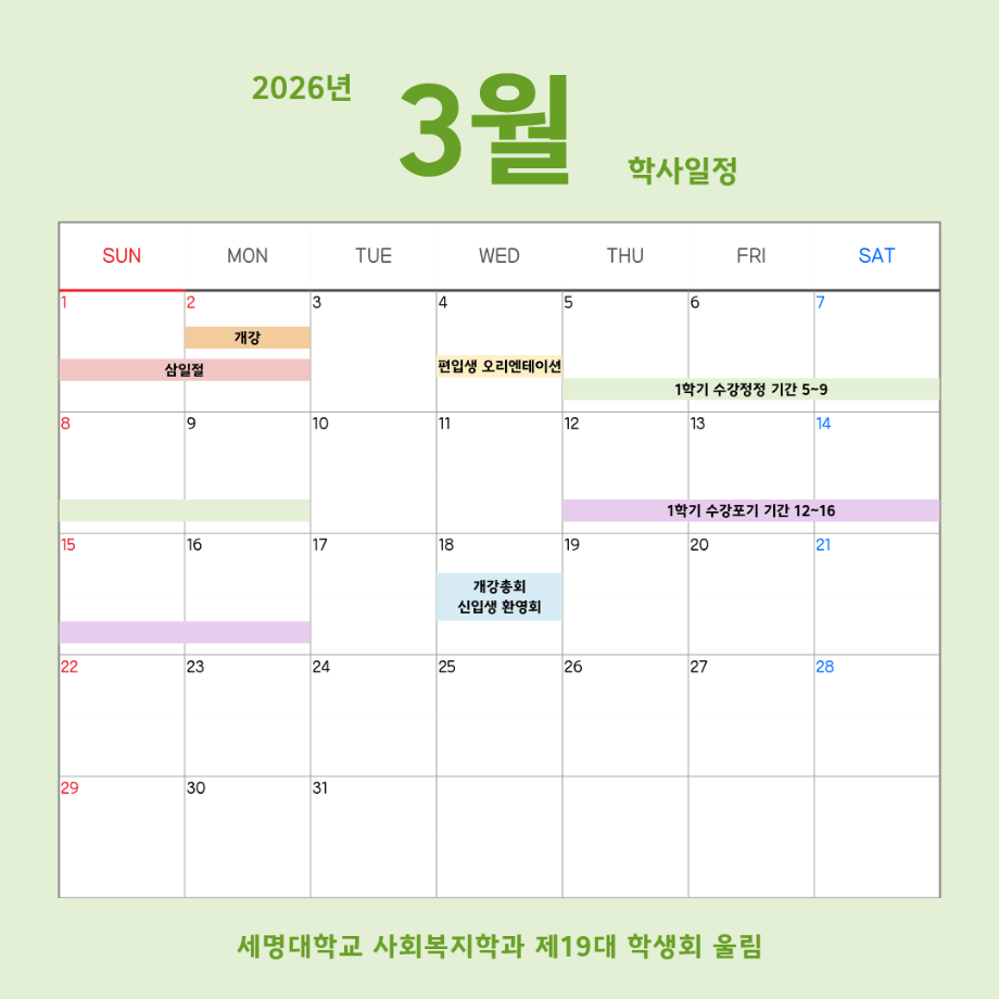 본문 시작 홈으로 커뮤니티 학과소개 교수소개 교육과정 현장실습 및 취업정보 커뮤니티 홈페이지가이드 학사일정 학과공지 학사일정 학생회 동아리 학생 소통 광장 포토갤러리 전공자료실 서식자료실 학사일정 페이스북 트위터 프린트 3월 학사 일정 사회복지학과 218 2026-03-04 3월 학사 일정입니다. 목록 이전2월 학사 일정 다음 4월 학사 일정 담당부서 : 사회복지학과 담당자 : - 연락처 : 043-649-1799 최종수정일 : 2024-10-26 만족도조사 만족도 조사 이 페이지에서 제공하는 정보에 대하여 만족하시나요? 매우만족 만족 보통 불만족 매우불만족