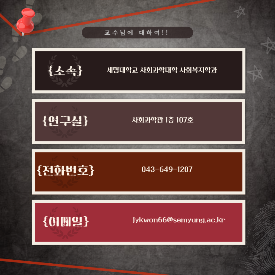 본문 시작 홈으로 커뮤니티 학과소개 교수소개 교육과정 현장실습 및 취업정보 커뮤니티 홈페이지가이드 학생 소통 광장 학과공지 학사일정 학생회 동아리 학생 소통 광장 포토갤러리 전공자료실 서식자료실 학생 소통 광장 페이스북 트위터 프린트 세명대학교 사회복지학과 권자영 교수님 알아보기 편 사회복지학과 3197 2023-02-24 '세명대학교 사회복지학과 권자영 교수님 알아보기편'입니다. 목록 이전세명대학교 사회복지학과 박소영 교수님 알아보기 편 다음 세명대학교 사회복지학과 노법래 교수님 알아보기 담당부서 : 사회복지학과 담당자 : - 연락처 : 043-649-1799 최종수정일 : 2024-10-26 만족도조사 만족도 조사 이 페이지에서 제공하는 정보에 대하여 만족하시나요? 매우만족 만족 보통 불만족 매우불만족