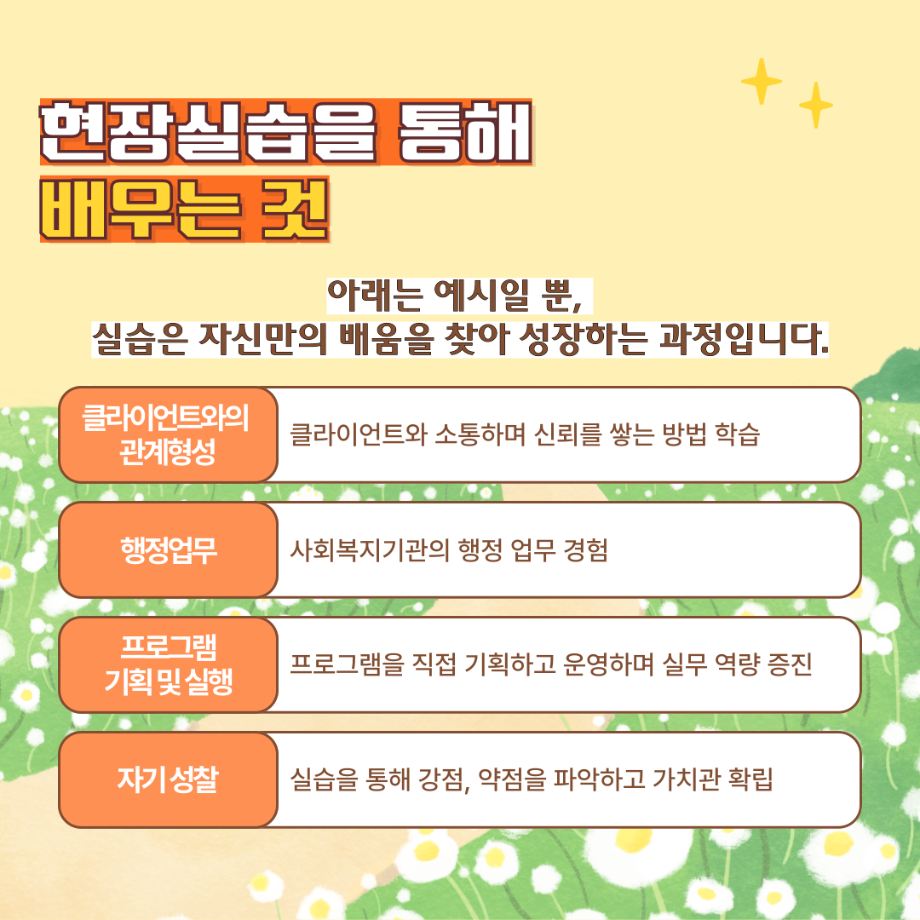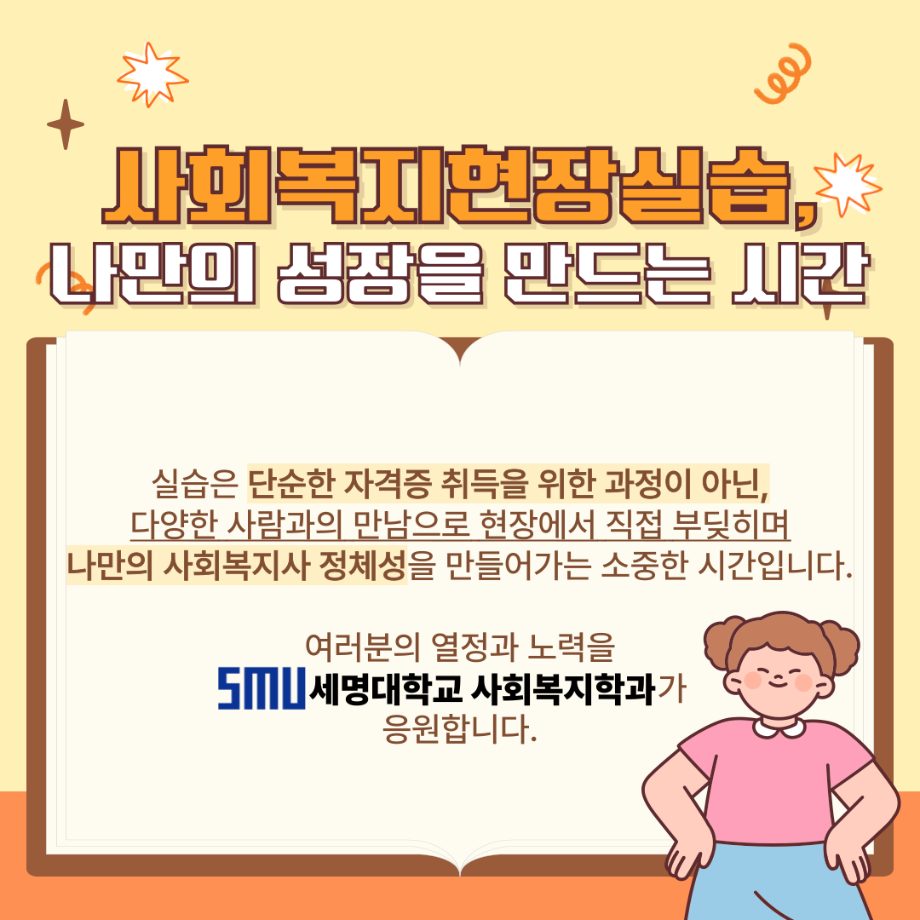 본문 시작 홈으로 커뮤니티 학과소개 교수소개 교육과정 현장실습 및 취업정보 커뮤니티 홈페이지가이드 학생 소통 광장 학과공지 학사일정 학생회 동아리 학생 소통 광장 포토갤러리 전공자료실 서식자료실 학생 소통 광장 페이스북 트위터 프린트 사회복지현장실습 알고 가자! 사회복지학과 1640 2025-08-04 오늘은 세명대학교 사회복지학과가 알려주는 '사회복지현장실습 알고 가자!' 편입니다. 목록 이전5월 8일은 어버이날입니다. 다음 사회복지현장실습 과정 안내 담당부서 : 사회복지학과 담당자 : - 연락처 : 043-649-1799 최종수정일 : 2024-10-26 만족도조사 만족도 조사 이 페이지에서 제공하는 정보에 대하여 만족하시나요? 매우만족 만족 보통 불만족 매우불만족