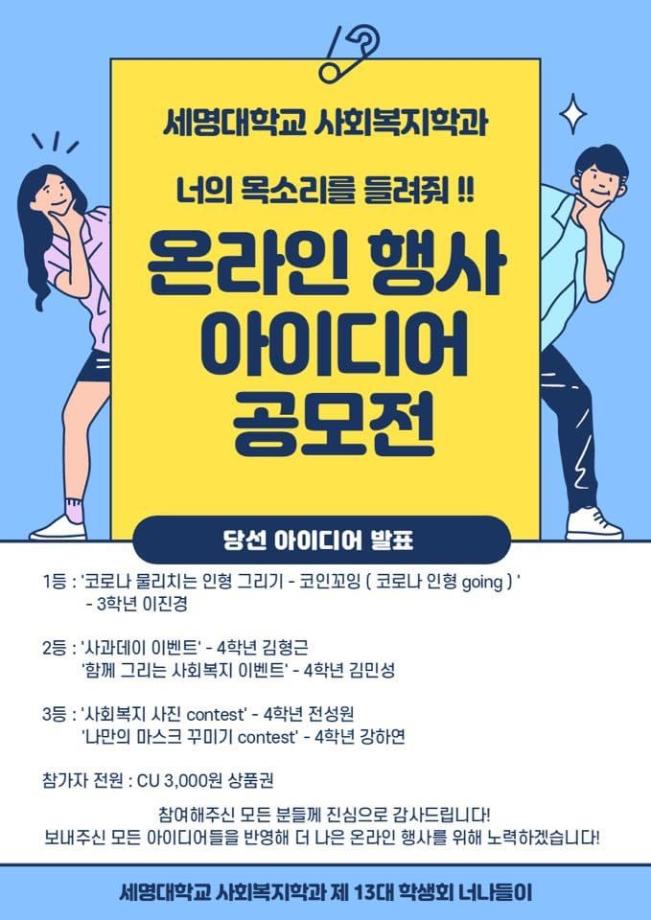 본문 시작 홈으로 커뮤니티 학과소개 교수소개 교육과정 현장실습 및 취업정보 커뮤니티 홈페이지가이드 학생 소통 광장 학과공지 학사일정 학생회 동아리 학생 소통 광장 포토갤러리 전공자료실 서식자료실 학생 소통 광장 페이스북 트위터 프린트 2020학년도 2학기 온라인행사 아이디어 공모전 사회복지학과 5727 2020-10-29 2020학년도 2학기 온라인행사 아이디어 공모전 진행사진입니다. 목록 이전2020학년도 1학기 온라인 행사(가정의 달 맞이 4행시이벤트) 다음 2020학년도 2학기 온라인행사 (사회복지의 날 기념 이벤트) 담당부서 : 사회복지학과 담당자 : - 연락처 : 043-649-1799 최종수정일 : 2024-10-26 만족도조사 만족도 조사 이 페이지에서 제공하는 정보에 대하여 만족하시나요? 매우만족 만족 보통 불만족 매우불만족